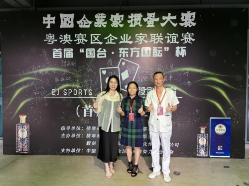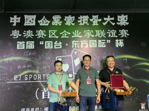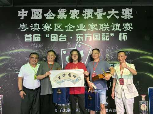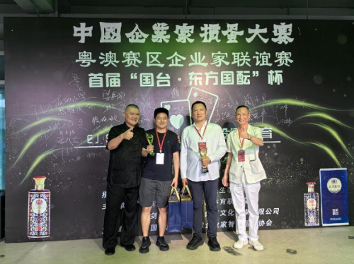 湛江市恒珍酒业负责人邓杰先生率队全程赞助支持赛事活动 本次比赛得到了湛江市恒珍酒业的赞助,贵州十大名酒国台“东方国酝”在赛事活动中闪亮登场,得到了企业家们的赞赏和认可。此外,中掼掼蛋(广东)俱乐部、横琴人寿、中澳莲花国际教育联合有限公司也给予了赛事大力支持;另外,以今日头条、凤凰网为首的众多媒体也争相报道;经过激烈的角逐,冠亚季军获奖者实至名归,获得了奖杯和丰厚的奖品。