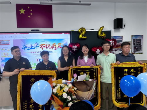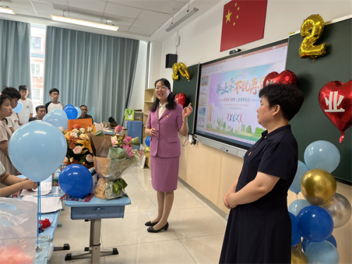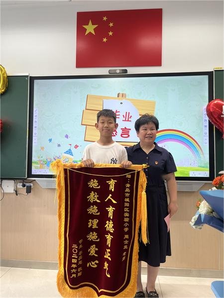 在过去的三年里,周士兰老师以其渊博的知识和无私的爱心,悉心教导着六年级三班的每一位同学。她的谆谆教诲如明灯照亮了同学们求知的道路,她的辛勤付出也赢得了同学们的敬爱和家长们的感激。 为了表达对周老师深深的敬意和感谢,家委会悄悄策划了一场特别的活动。他们精心布置了教室,准备了毕业蛋糕,部分家长代表送上了一面面饱含深情的锦旗。锦旗上绣着“师恩难忘,辛勤耕耘”“育人育德育正气”“春雨润物,明德育才”……这不仅是对周士兰老师教育工作的高度赞扬,更是家长们对老师辛勤付出的诚挚认可。 校长牛秀娟亲自参加了送锦旗仪式,她在仪式上发表了热情洋溢的讲话,对周士兰老师的工作给予了充分肯定,并对即将毕业的同学们寄予了殷切的期望。牛校长鼓励同学们在未来的学习和生活中,继续保持积极向上的态度,努力追求自己的梦想。