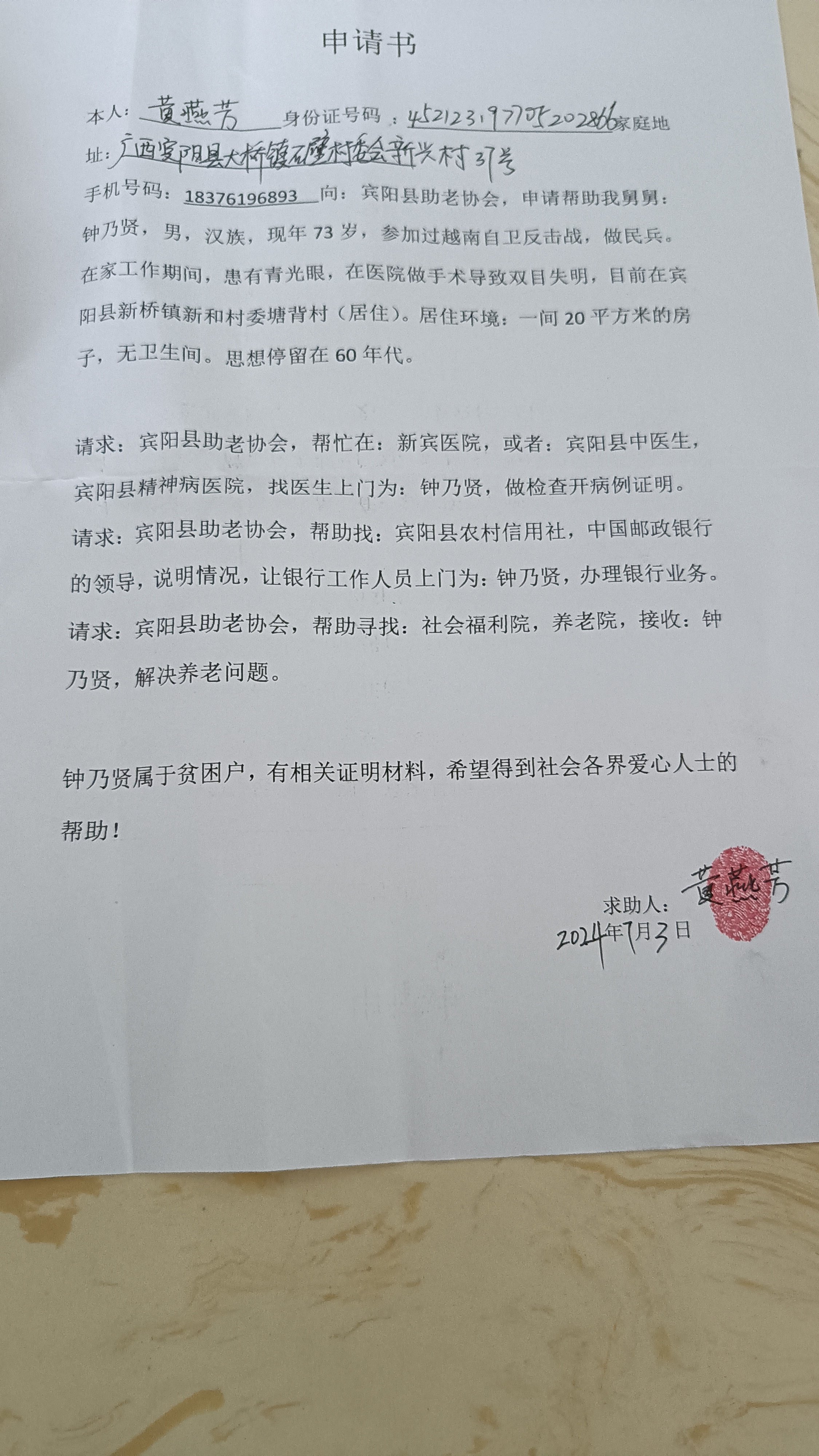 宾阳县助老协会亲自到新桥镇新和村委核实情况,经过村委核实:钟乃贤,属于越战老民兵,现在属于五保户,特困户。