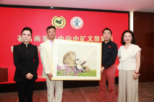 中共陇南市委常委、武都区委书记肖庆康向刘中先生颁发收藏证书 2024年6月30日,在中矿文旅集团总部举办“感恩之路:中矿文旅集团与中国文学艺术基金会熊猫艺术发展基金签署战略合作协议仪式”上。为推动熊猫艺术助力文旅事业进一步的深入合作,作为熊猫艺术发展基金发起人,著名熊猫画家刘中向中矿文旅集团捐赠《丝路国宝五洲行》之中国与新加坡友好篇限量版画等,共计十余幅版画作品。