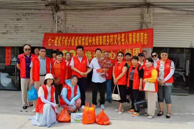 2024年6月30日星期天上午,在今年“七一”建党节来临之际,安徽省蚌埠市同心公益团在刘华团长率领下一行十多人,冒着高温酷暑,打着旗帜和条幅,深入怀远县魏庄镇偏远乡村,走访慰问活动弘扬社会正能量。 首先他们来到已经九十六岁高龄、老党员、学雷锋标兵、退休教师孙善佳的家中,向他送上鲜花、水果、糕点及慰问金。传递社会大家庭的关怀与温暖,同时致以诚挚的党建日问候。并与他促膝交流谈心,询问他的身体状况、生活情况等。随后,蚌埠市同心公益团一行又看望该镇一位曾受到过团中央和文化部劳模表彰的“青年文化名人”获得者励志残疾青年人施福明同志,他身为乡村人却长期爱做社会公益,为乡村振兴积极建言献策,一如既往地关心支持家乡奋勇发展精神令许多人感动。 此次活动期间还现场进行了慰问歌舞表演,真是:“慰问暖人心,浓浓深情颂党恩”,据了解:这家公益团队,组建于2021年1月1日,是来自全国各地爱心人士自愿组建的松散型学雷锋团队 ,对外开展53次公益活动,对内开展48届团建活动,他们常年开展慰问老党员、退役军人、劳动模范、敬老院孤寡老人、特困户等社会公益活动。团队秉承弘扬孝道美德,爱老助残,传播正能量,用实际行动传递爱心,播撒希望。他们的公益团口号是:“帮助他人,快乐自己”用一颗火热的心温暖着世界。