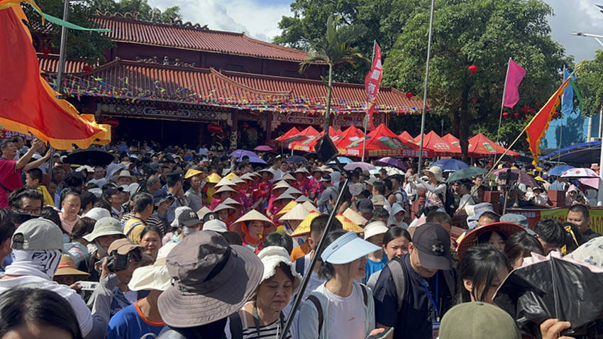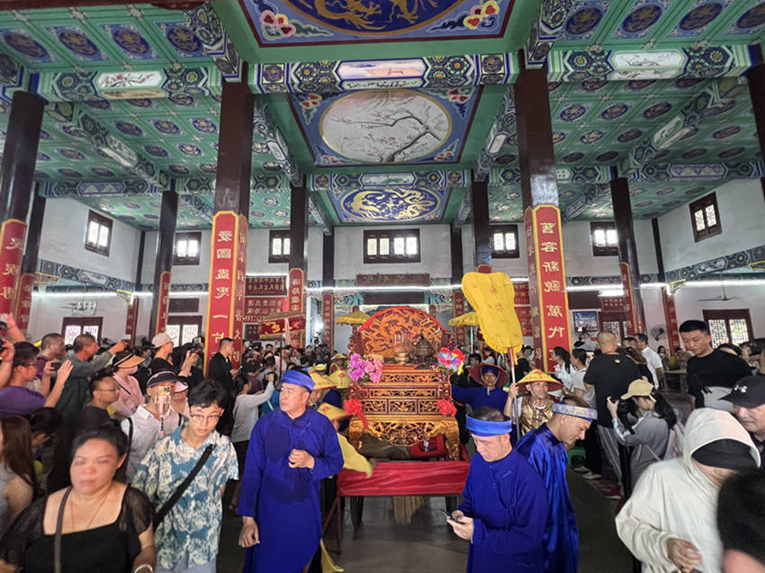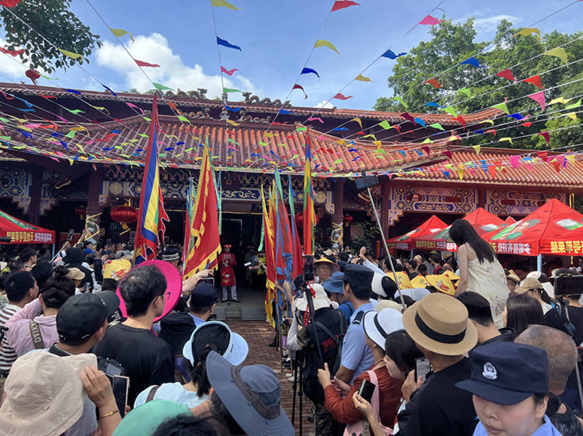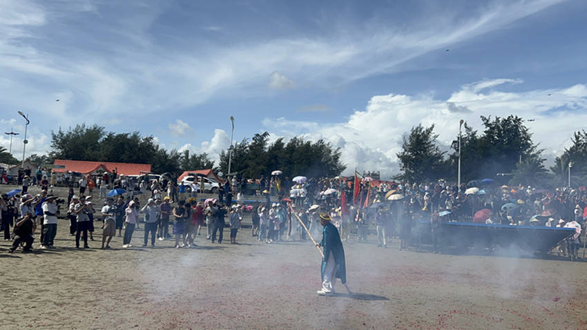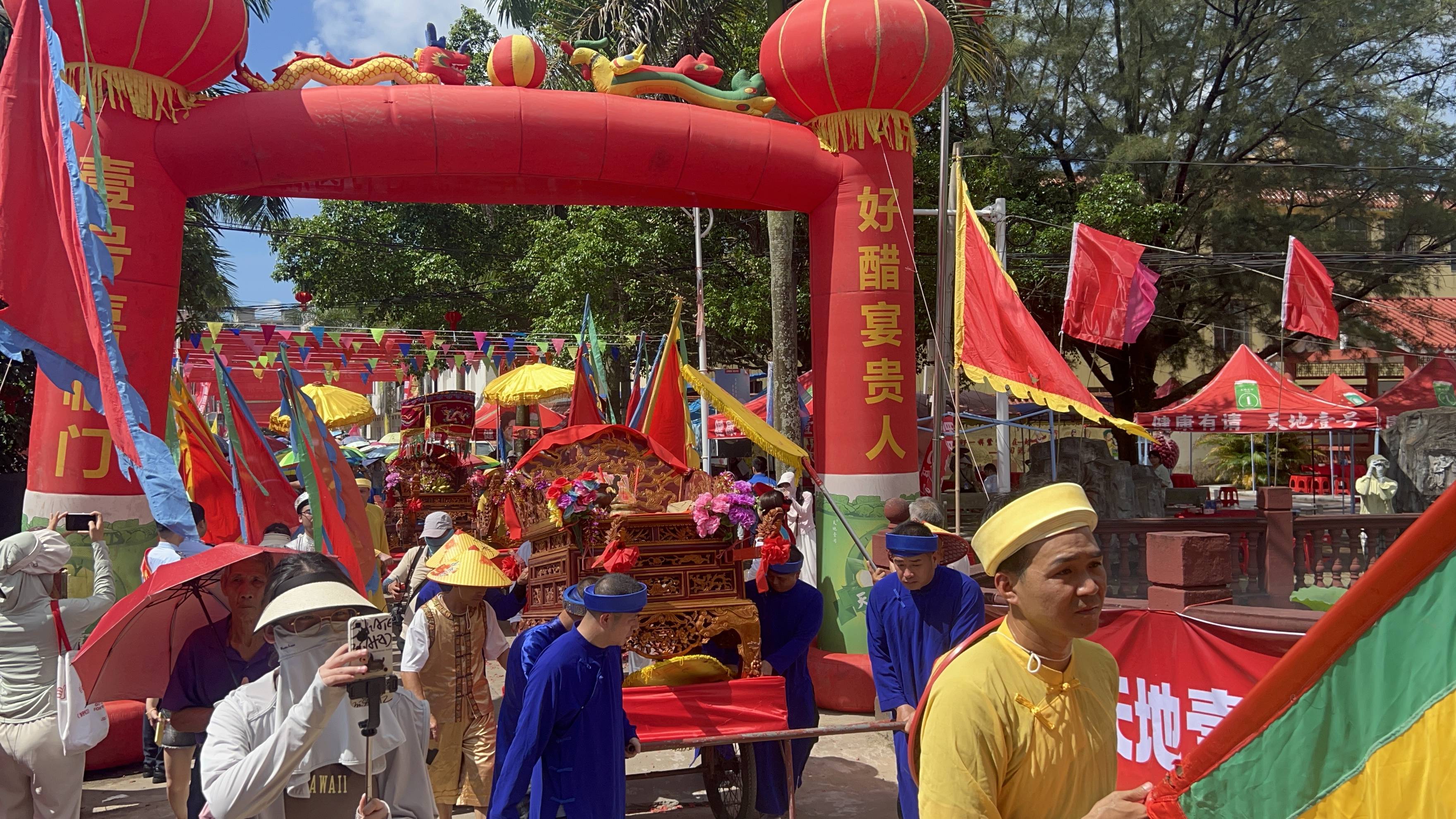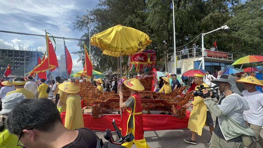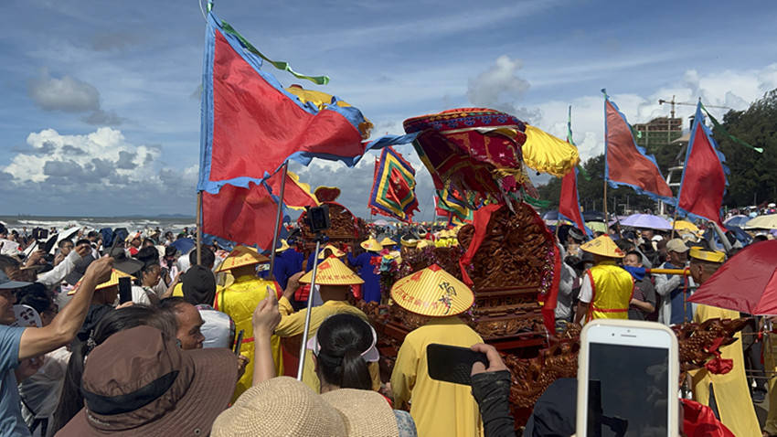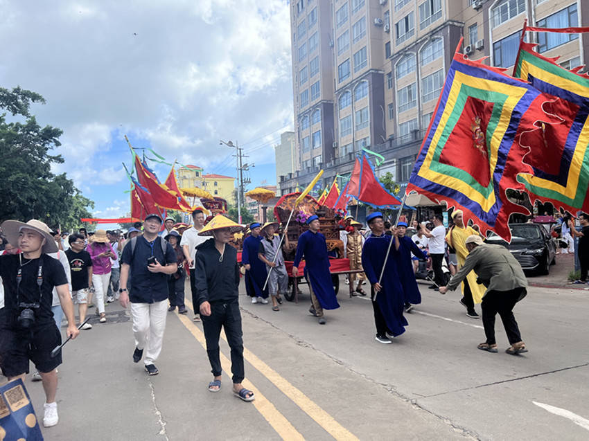 上午9时38分,随着锣鼓声的响起,身着京族传统服饰的迎神队伍从哈亭出发,敲锣打鼓护卫着象征吉祥的“龙车”,缓缓走向海边。他们虔诚地恭请“海神”,并将其迎回哈亭敬奉,祈求五谷丰登、安康顺遂。这一传统仪式不仅体现了京族人民对海洋的敬畏与感恩,也展现了他们对美好生活的向往与追求。