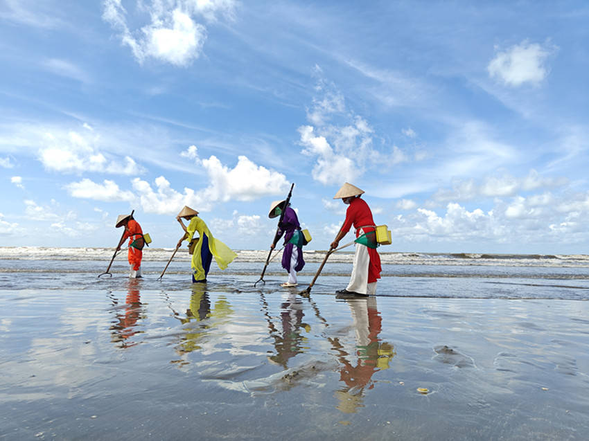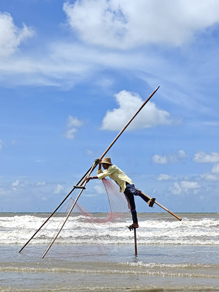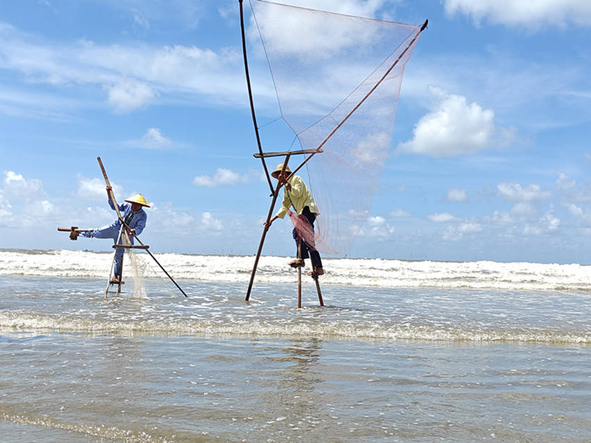 在哈节期间,海边还举办了京族非遗文化展演。京族同胞们向游客们展示了耙螺、高跷捞虾等传统渔业劳作,让游客们亲身体验到了边海渔乐的乐趣,感受到了非遗文化的魅力。这些传统技艺不仅承载着京族人民的历史记忆,也是他们智慧的结晶和文化的传承。