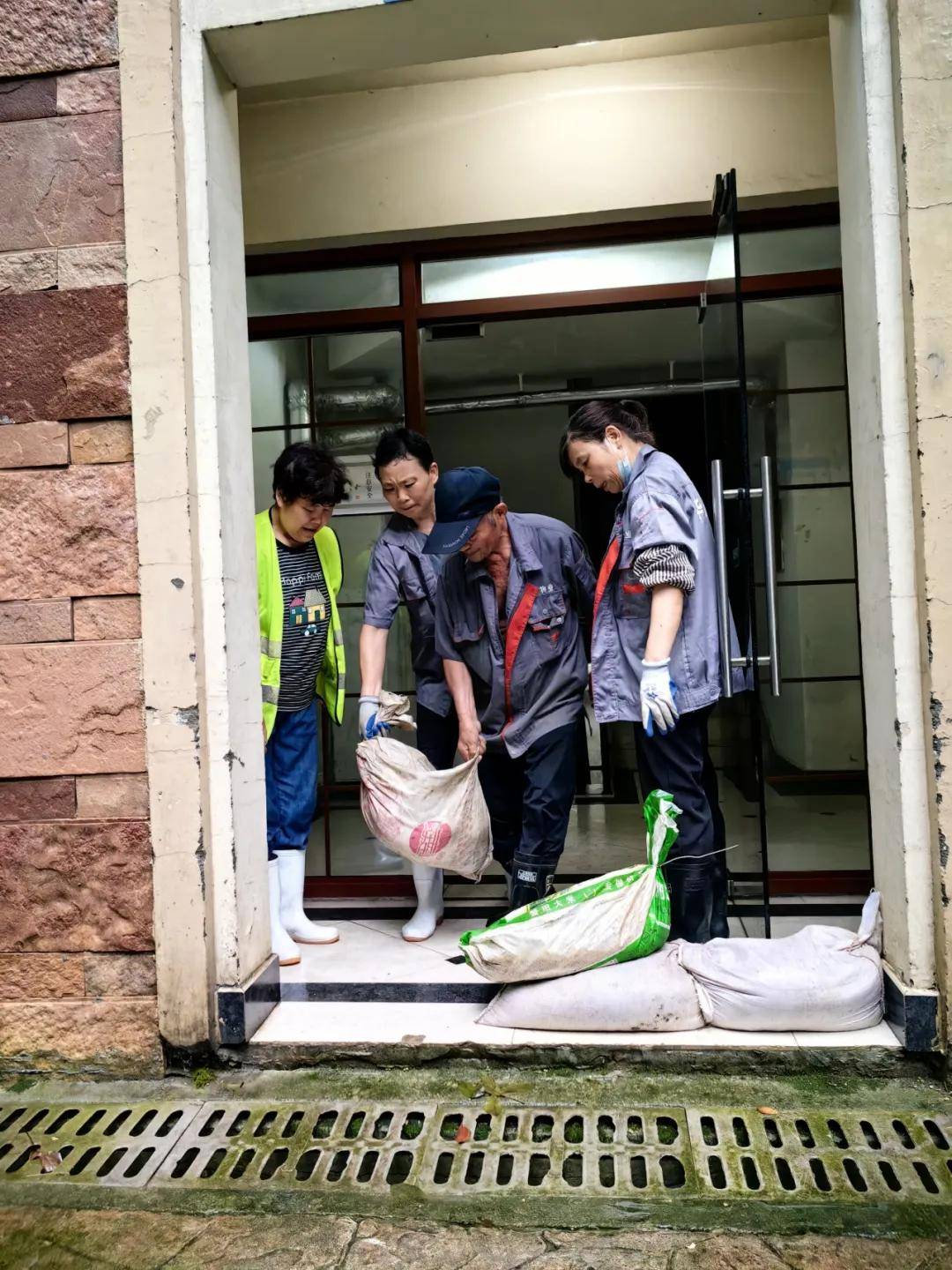 在小区的入口处,有的物业人员则忙碌着堆放沙袋,建立起一道道坚固的防线。他们的动作迅速而有力,每一次弯腰、每一次举起,都透露出坚定和决心。沙袋在他们手中传递,不仅是物理上的防护,更是对守护家园的无声承诺。