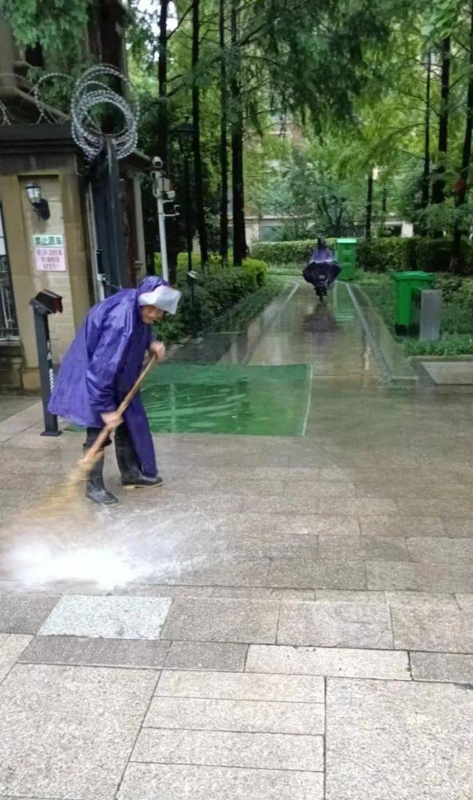 在暴雨的肆虐下,华广物业的员工们没有退缩,他们的脚步在雨中坚定而迅速。他们穿梭在小区之间,全力以赴地应对暴雨带来的挑战。虽然视线受到雨水的干扰,但他们的行动并未停歇,以确保小区的基本运行和居民的安全。