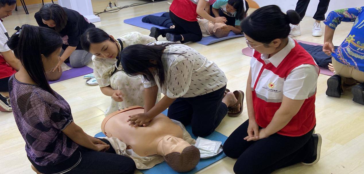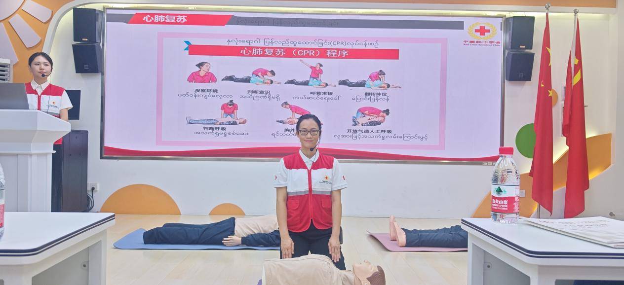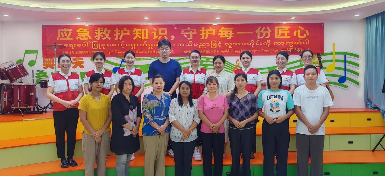 刘凌老师向缅甸学员介绍广西经贸学院红十字文化传播基地的基本情况,围绕红十字运动知识、心肺复苏术以及海姆利克急救法三个方面进行理论讲授,运用直观的教学模型和模拟场景,让学员们在轻松愉快的氛围中掌握应急救护技能。在实操环节中,由王琴老师上阵指导,学员们分组练习,积极参与互动。以理论与实践并重的教学模式,不仅提升了学员们的安全意识,加深他们对急救知识的理解,也增强了他们在实际工作和生活中应对突发事件的能力。 本次培训在吴兴兴教授弹唱的《我和我的祖国》歌声中落下帷幕。下一步我校红十字会将继续与国内外学校紧密合作,为营造“人人学急救,急救为人人”的良好氛围贡献力量。