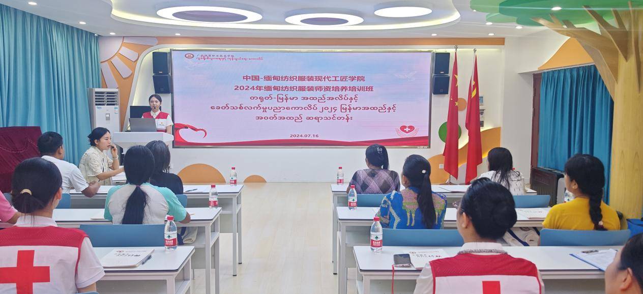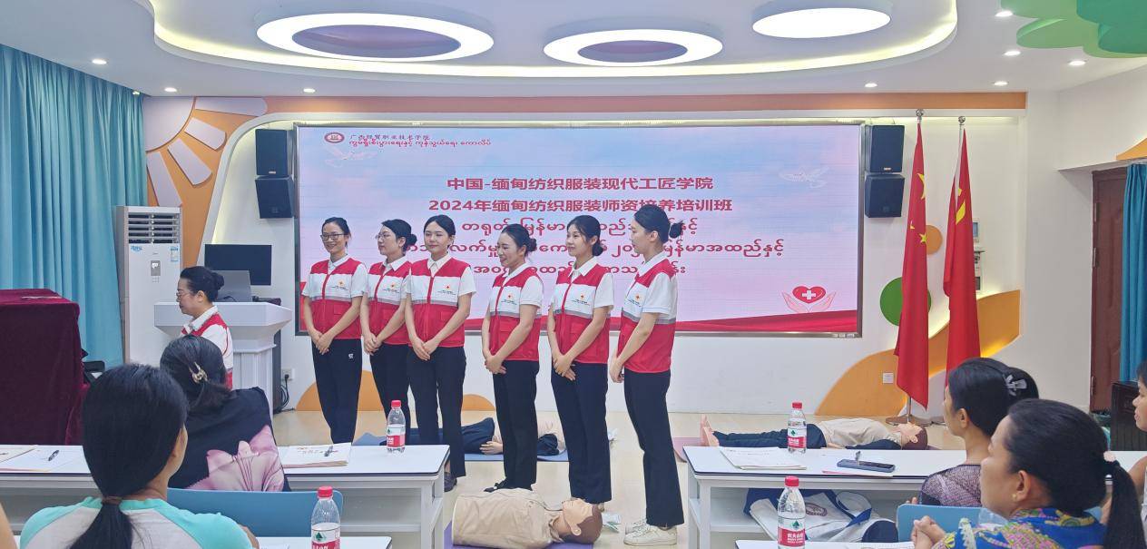 7月16日下午,广西经贸职业技术学院红十字会积极响应国际人道主义精神,为中国—缅甸纺织服装现代工匠学院2024年缅甸纺织服装师资培养培训班的8名学员讲授《应急救护》课程。学校党委委员、副校长林震,广西经贸职业技术学院财会金融学院党总支书记、院长、大健康教学团队负责人吴兴兴等教师参加培训。