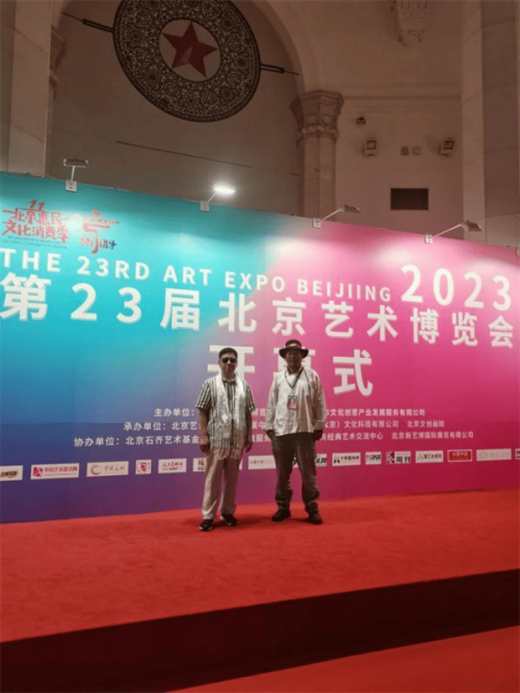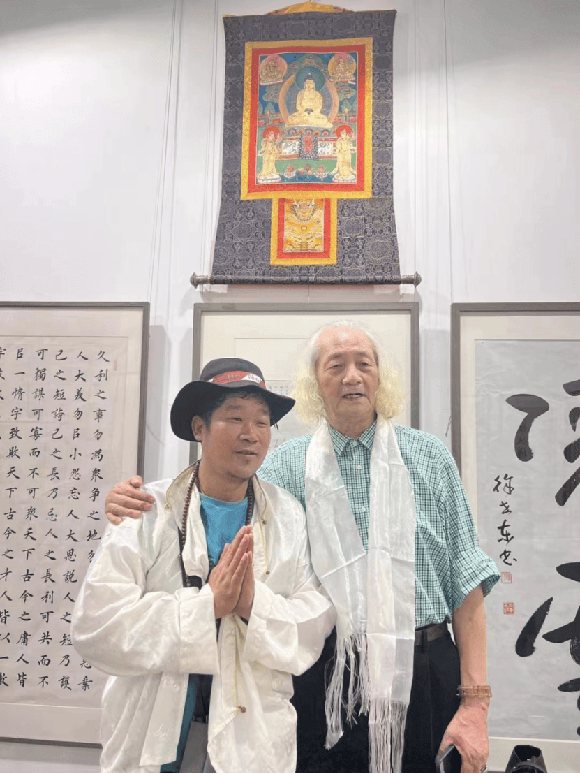 (著名书画艺术评论家王仲先生与多杰才让先生在其作品前交谈后合影留念)