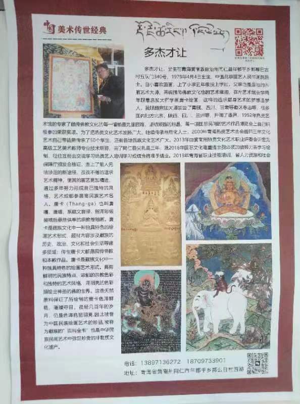 多杰才让先生艺术简历 多杰才让,出生在青海黄南族自治州同仁县年都乎乡郭嘛日古村五队门 340号,1979 年 4 月 4 日出生,中国北京国艺人民书画院院士。自小喜欢画画,上了小学五年级没上学过,父亲也是当地的木雕艺术大师,再说藏传佛教文化也因艺术细胞,在州艺术馆去学两年跟着启加大师学画唐卡绘画,这样的追求献身艺术的梦想追梦人,我父亲跟随启加大师宗去了青藏、四川、甘肃等藏区寺庙等,很多国内地方北京、陕西、四川、兰州等,开阔了眼界。 1992年热贡艺术馆的专家宗者拉杰中国藏族文化艺术彩绘大观参加了去启加师傅画了三年,西藏甘肃四川三各纸的艺术文化,学习了五年 1996 年完成了藏传佛教文化的每一幅都是克服困难,坚韧顽强的结晶,每一项国际民间的艺术作品博览会上自己积极参加荣获奖项。 为了把热贡文化艺术发扬光大,继续传承与后化人士,2000 年青海热贡艺术协会画师三年文化艺术自己带徒弟传承了50个学生,还有各地民族文化艺术广大。2013 年由黄南州热贡文化艺术职业评委会评定为高级工艺美术教师专业技术职称,去了同仁县尖扎县三年,就 2016 年国际文化隆重提出我必须加倍努力去学习绘制,征住互相去交流学习热贡艺人培训学习成绩合格准予结业。 2013 年青海省职业技能培训,省人力资源和社会保障厅颁发合格证,走上了前人无法涉足的新途径,孜孜不倦的追求艺术精神,使其的画艺更加精进,通过多年努力形成自己独特的风格,艺术成都参展商民族艺术名人。唐卡(Thang-ga)也叫唐嘎,唐喀,系藏文音译,指用彩缎装裱后悬挂供奉的宗教卷轴画。唐卡是藏族文化中一种独具特色的绘画艺术形式,题材内容涉及藏族的历史、政治、文化和社会生活等诸多领域;传世唐卡大都是藏传佛教和本教作品。 唐卡是藏族文化中一种独具特色的绘画艺术形式。具有鲜明的民族特点、浓郁的宗教色彩和独特的艺术风格, 用明亮的色彩描绘出神圣的佛的世界。这些天然原料保证了所绘制的唐卡色泽鲜艳,璀璨夺目,虽经几百年的岁月,仍是色泽艳丽明亮.因此被誉为中国民族绘画艺术的珍品,被称为藏族的”百科全书”也是中华民族民间艺术中弥足珍贵的非物质文化遗产。
