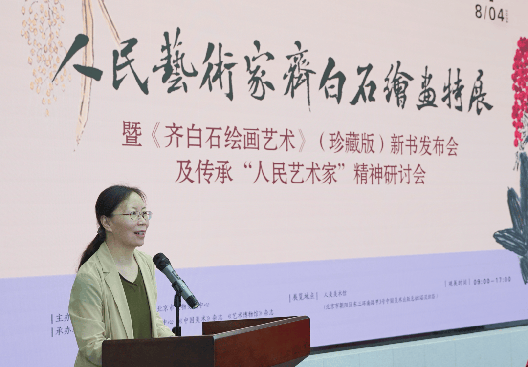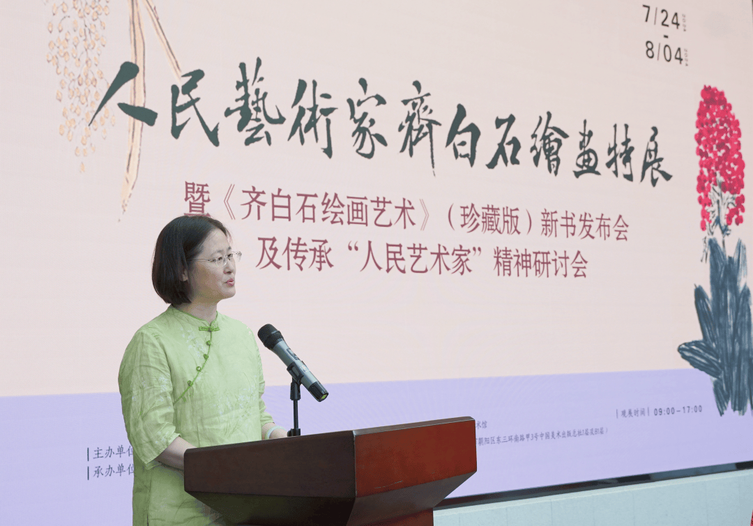 人民美术出版社总经理赖雪梅主持开幕式 人民美术出版社总编辑高世屹在致辞中表示,“人民艺术家——齐白石绘画特展”是人民美术出版社花费半年时间精心筹备的大展,具有三个方面的意义。一是致敬经典,厚植根基,通过出版、展览、研讨会等多种形式让广大人民群众感受经典的力量;二是弘扬经典,赓续文脉,通过对齐白石、娄师白、娄述德三代艺术家作品的同台展示,完成一次经典与传承的深度对话;三是传播经典,普及大众,自20世纪50年代至今,人美社先后编辑出版过45种有关齐白石的出版物,在人美社70余年的历程中,平均不到两年就出版一本有关齐白石的图书。无数读者通过这些图书,认识了大师齐白石,临摹学习了齐白石的经典作品,提高了自己的审美素养和文化涵养。