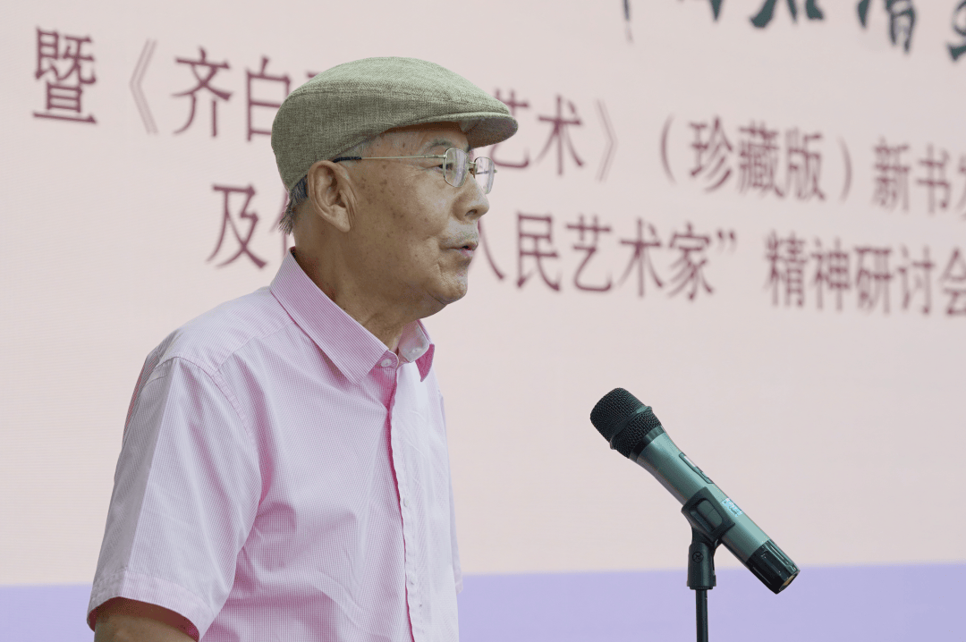 《齐白石绘画艺术》改编者娄述德先生讲话 人民美术出版社副总编辑王远宣读了中央美术学院、中央数字电视书画频道的贺信。中央美术学院的贺信中写道,人民美术出版社举办此次活动,响应时代召唤,展现担当作为,意义绵延深远。人民美术出版社不断推陈出新,在感受历久常新的艺术魅力中汲取前进的勇气和力量,不断深耕校园美育沃土,推进新时代美育创新。中央数字电视书画频道的贺信中写道,此次活动是对艺术家齐白石先生的艺术成就全面展示,更是一次有影响力的学术交流活动。相信人民美术出版社的活动一定能取得丰硕成果,成为一次艺术与学术的盛会,为推动中国传统文化艺术的繁荣发展做出新的更大贡献。