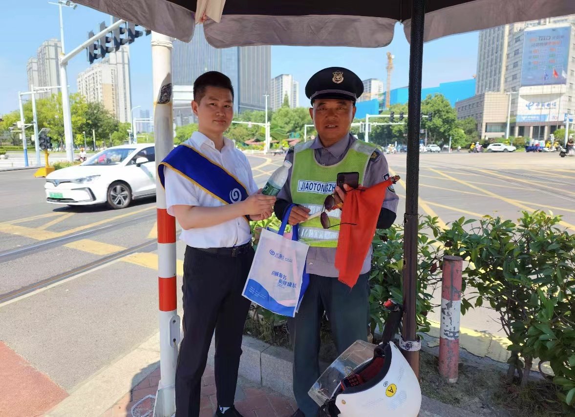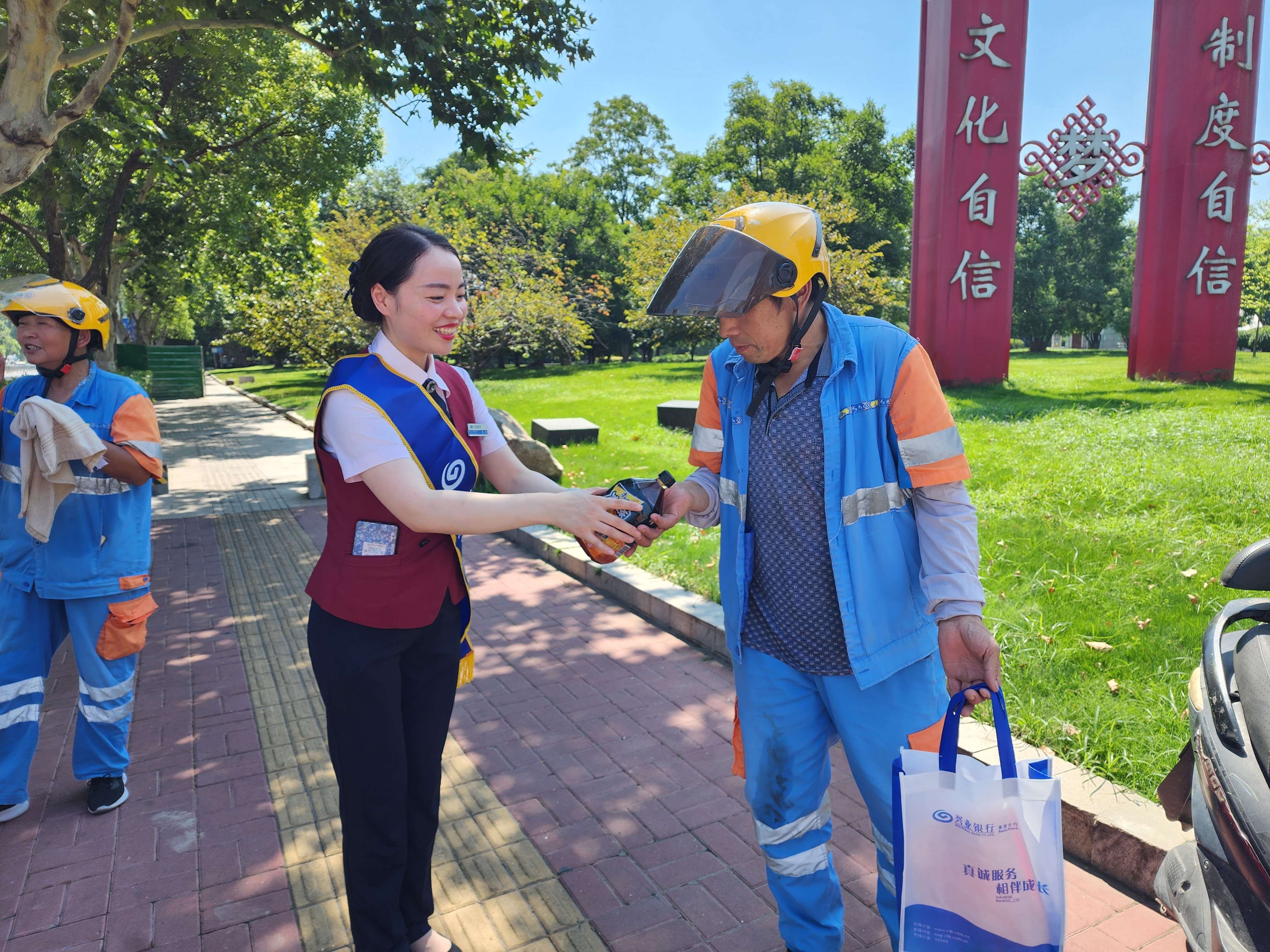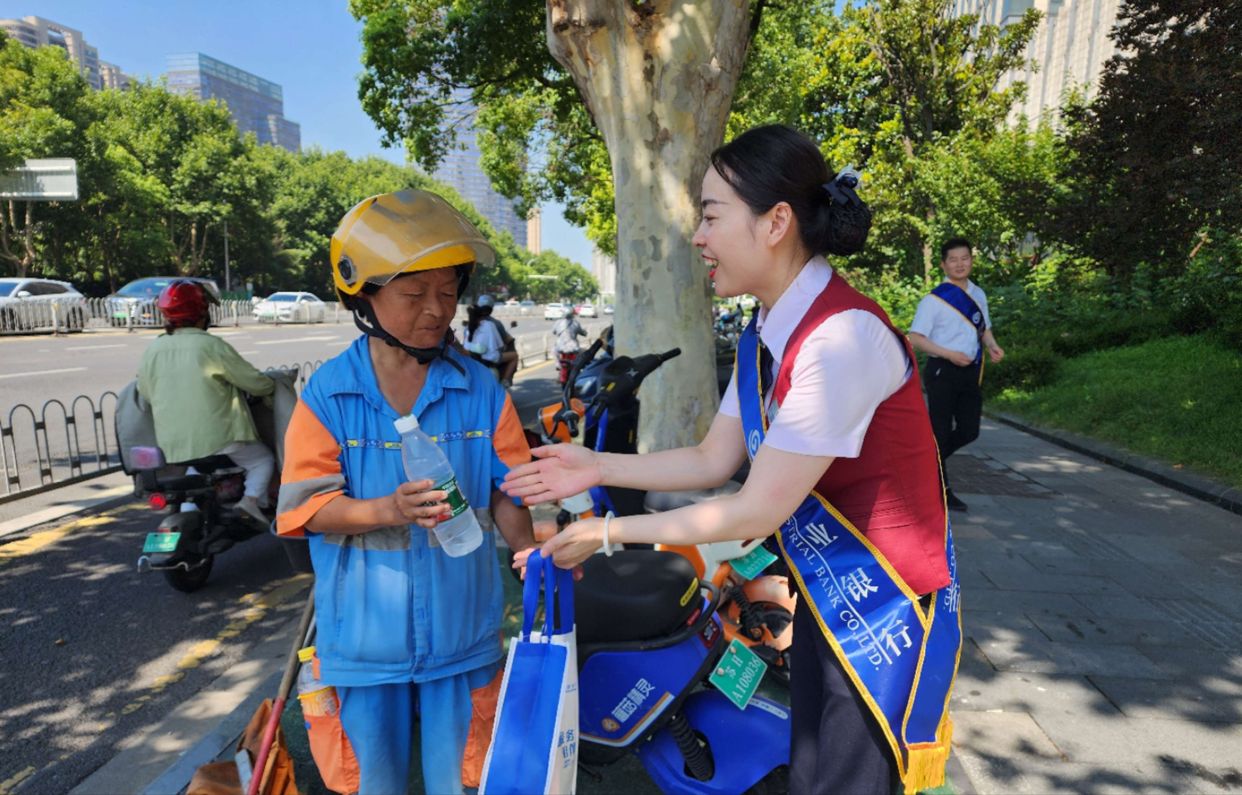 炎炎夏日,酷暑难耐,兴业银行银行淮安分行为表达对环卫工人、道路执勤人员的关心与关爱,积极开展“炎炎夏日·送清凉”系列公益服务活动。分行营业部的“清凉使者”们将矿泉水、冰红茶等送到他们的手中,关心他们在辛勤工作的同时,注意自身的防暑降温,保证身体健康安全。同时向他们普及防范电信诈骗、合规用卡等金融知识,增强风险防范意识。大家纷纷表示,这个夏天不再只有酷暑,更有温情相伴。