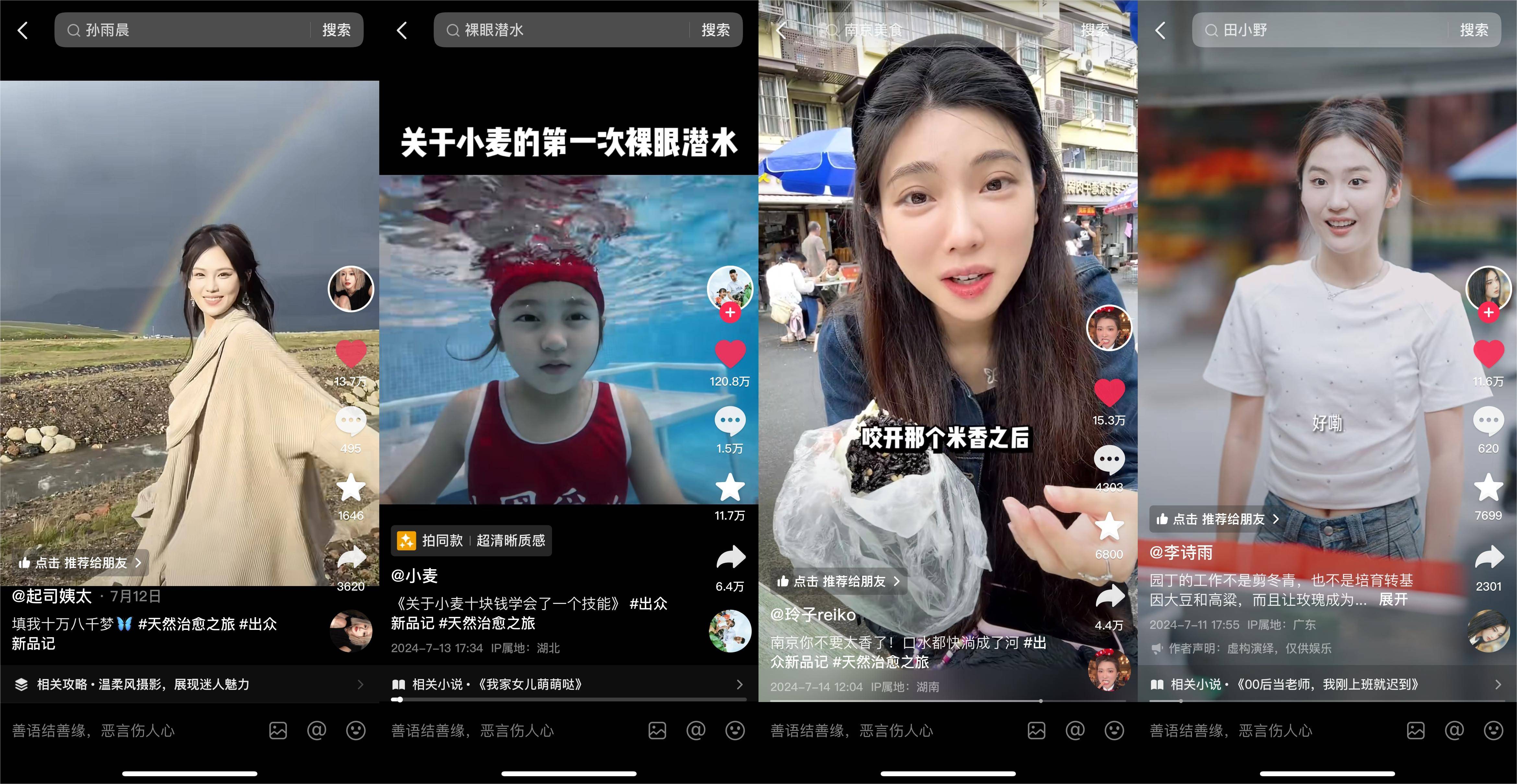 以品牌大使钟楚曦为例,从短片中可以看到,她在“生态能量圈”的指引下,走进自然、拥抱柔软、感受清新,开启了一场感官治愈之旅,把“生态科技”能量,落入到具象的场景里,“让生活慢下来,触摸时光的美好”。 勾勒出每个人向往的天然治愈场景,这也是一个典型的通过情绪共鸣与用户进行品牌理念传递、沟通的解法,也让超能与其他品类品牌的常规营销形成了有效区隔。 与此同时,自带影响力和个人标签的明星,也成为品牌拉近与消费者之间的关联纽带。作为品牌大使,钟楚曦以专业、专注的态度,打造了一个个“天然鲜活”的角色,时刻绽放“天然本色”的个性魅力。而这与品牌“天然超能”的属性不谋而合。这次“天然”联合让双方都收获了更多的声量和点赞,实现了影响力共振,《出众新品记》的活动热度被快速拉升,为话题的传播和品牌下一步活动做了充足铺垫。 助力营销破圈,形成多渠道曝光话题场 让明星达人共创放大营销势能只是第一步,更重要的是,巨量引擎《出众新品记》手握以抖音为代表的巨大流量场和多样转化资源,通过多渠道布局,为品牌找到破圈增量新解法。 一方面,在线上,邀请更多垂类粉丝符合品牌目标人群的达人,为品牌活动话题造势发声; 自超能《出众新品记》内容发布以来,巨大的流量引发广泛的关注和讨论。而在随后的几天,《出众新品记》邀请了颜值、亲子、美食、剧情等多领域头部作者参与话题预热,为活动破圈埋入传播基因,以“天然治愈之旅”为主的相关话题也在平台上获得巨大声量。 比如,颜值达人@起司姨太 在视频里展示了自己旅游的画面,走入山川田野,置身在大自然中,收获满满的松弛感,这是旅行带来的治愈力。 亲子达人@小麦 分享了小朋友学习游泳的过程,经历了多次失败后,终于学会了裸眼潜水,小麦的勇气和可爱颜值让人心都化了,这是生活本身带来的治愈力。 美食达人@玲子reiko 用镜头记录了自己在南京旅行时吃到的各种美食,为用户带来了一场场视觉与味觉的双重盛宴,让人感受到视频中传递出来的温度和烟火气,这是食物带来的治愈力。 还有剧情达人@李诗雨 通过年轻人喜闻乐见的短剧形式,演绎了老师帮助被造谣的学生澄清真相的故事,感动之余,更多是温暖,这是人心向善带来的治愈力。