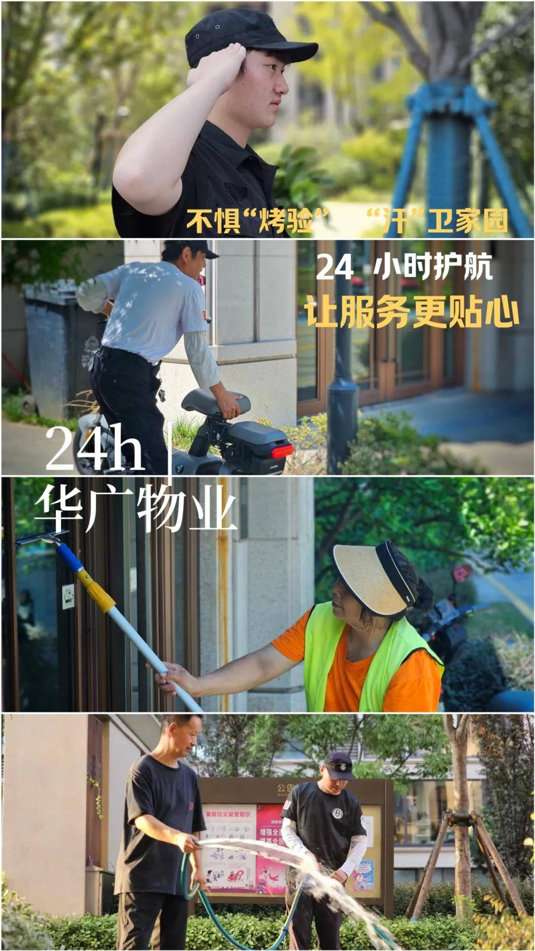 在炎炎夏日的热浪中,当城市的节奏被烈日炙烤得缓慢而沉重时,有这样一群人,他们无惧高温,以汗水为伴,坚守在自己的岗位上用汗水与努力编织着家园的温馨与安宁。他们是华广物业的守护者,是家园的默默守望者。