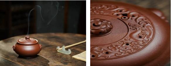 甲辰初春,书友邀我去新装修的茶室品茗。清泉烧开注壶,加入宜红新茶,顿时香气四溢,满堂温馨。闲聊间,不远处飘来淡淡的幽香,这是顶级沉香的气味。众友人不约而同地谈论着沉香不菲的收藏价值。此时我注意到的不是沉香,却是那古色古香的香炉。即问主人,那香炉是何人所为。主人滔悠悠地介绍道:“此香炉是青年制陶艺人葛剑的大作。”那葛剑又是何许人也…… 葛剑,丁蜀镇人,工艺美术师,1988年生,从艺近二十年。少时拜制壶高手叶永君先生为师。系统学习制壶、雕塑、印版贴塑、浅浮雕等各种制作手法。多少年的刻苦钻研,现已初露端倪,风格鲜明,典雅高贵,既有古风,又有新意,并在各类制陶比赛中屡屡获奖,得到了业界的重视和好评。