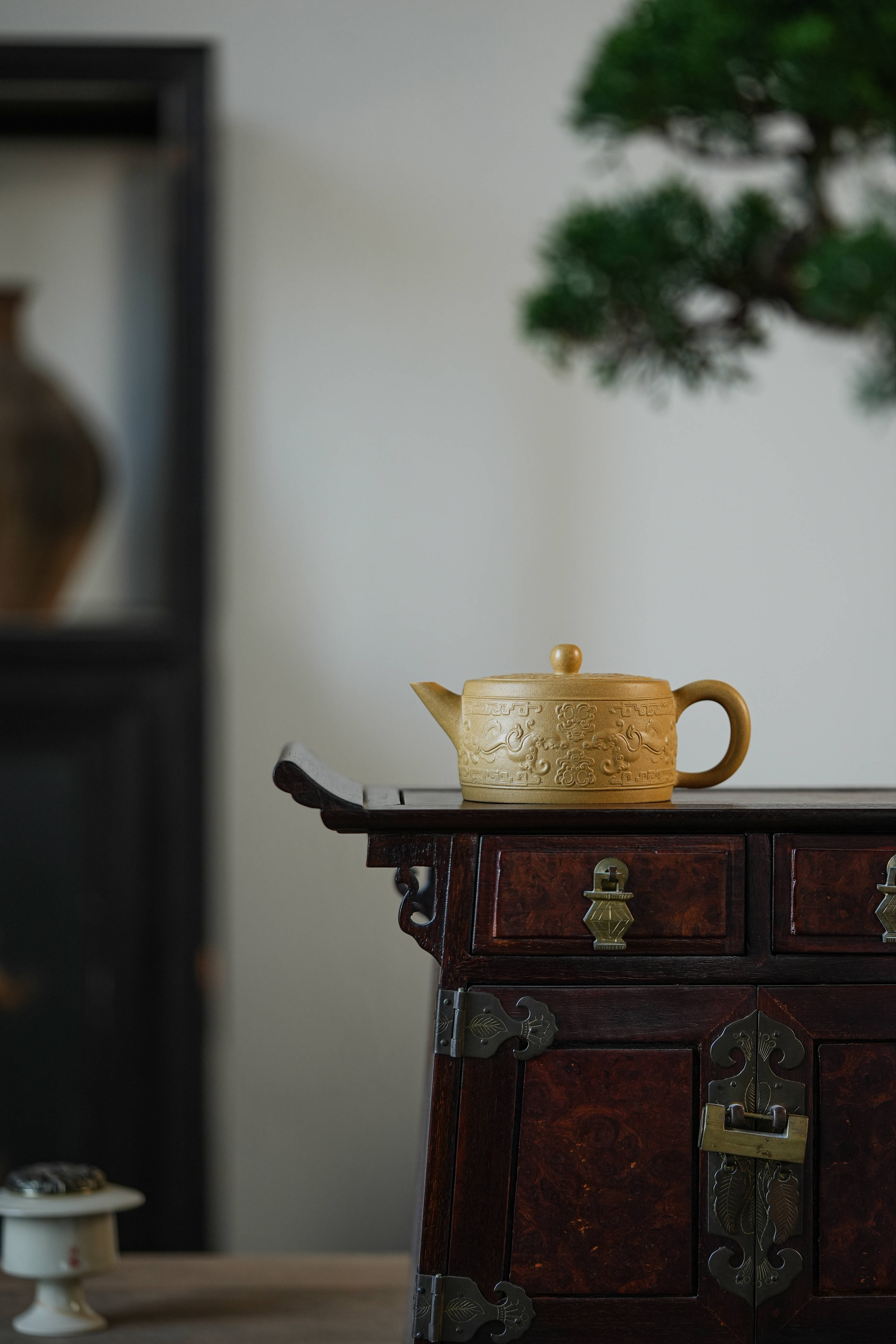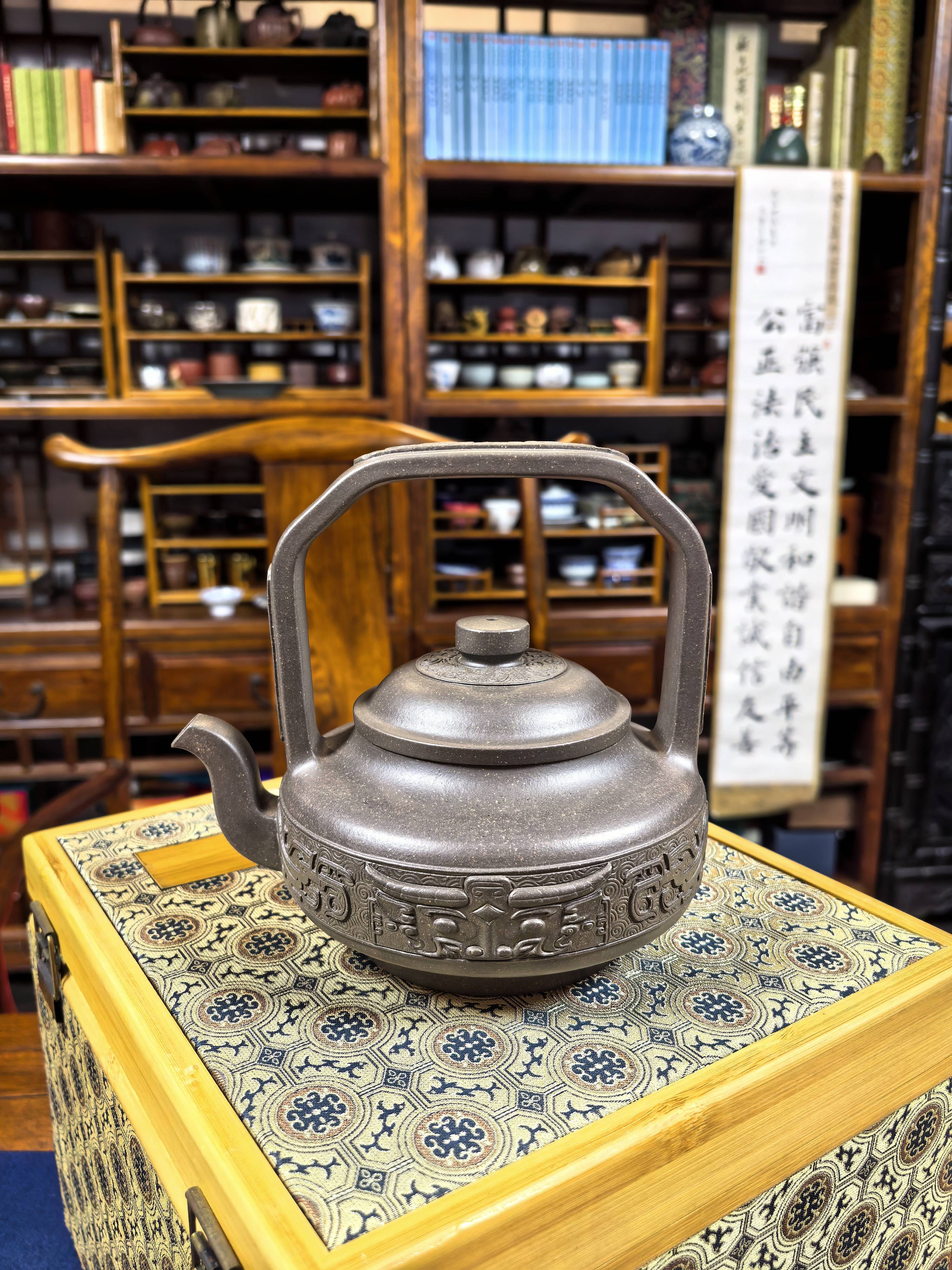 《吉金》汉代以前金往往指青铜,青铜器是中国古代最重要的艺术品之一,此作品即还原青铜器文化之精髓,吉金为礼器,用紫砂泥塑造其身形,并附以青铜器兽首纹,凤鸟纹等纹饰装饰,韵味十足,实为紫砂作品中的佼佼者。 《珏系列之玉带提梁》此提梁壶结合超高难度的制壶工艺,壶身挺拔大气,线条优美,严谨规整。另外青铜器纹饰装饰为加分项,又是一项高要求、高难度的挑战,使整把作品更显霸气古拙,伟岸壮观,这是紫砂与青铜器融合创新之作,亦可视为炫技巧思之作。