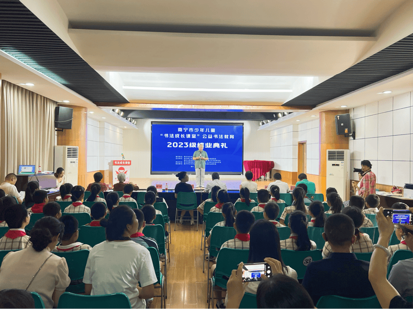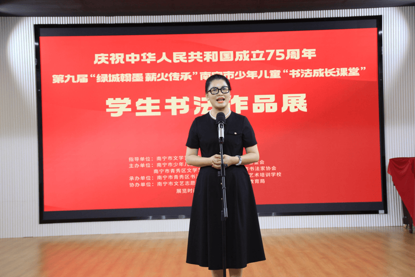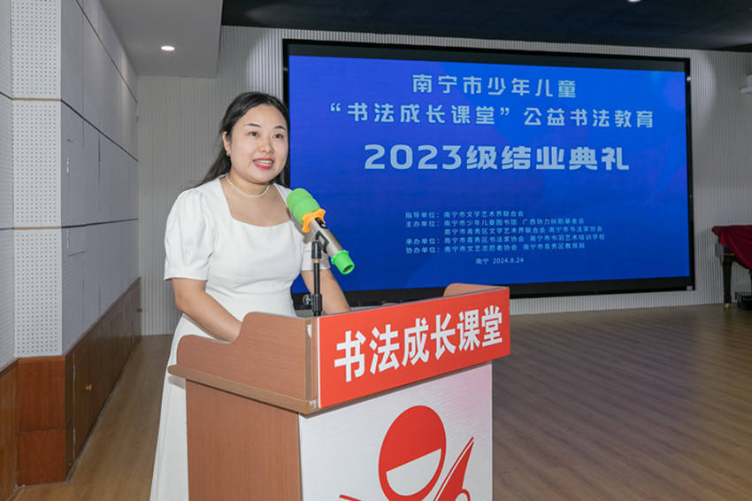 南宁市少年儿童图书馆副馆长陆庆在致辞中表示:希望同学们能够将在课堂上学到的书法技巧和领悟到的书法精神,融入到今后的学习和生活中。继续保持对书法的热爱,不断学习,让书法成为你们生活中的一部分,成为你们表达情感、展现个性的独特方式,在未来的人生道路上,如同你们笔下的书法一样,刚劲有力,精彩纷呈!