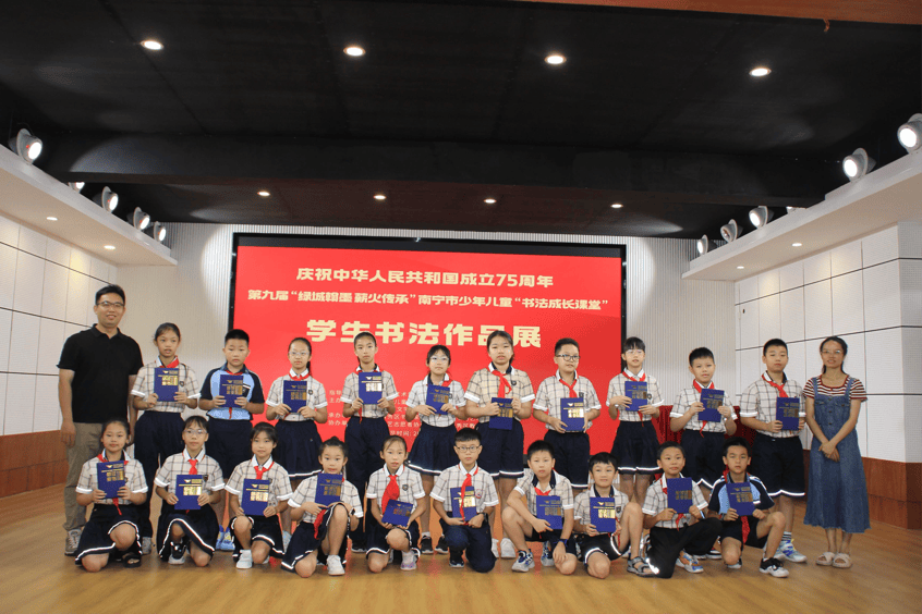 本次活动还举办了庆祝中华人民共和国成立75周年一一 第九届“绿城翰墨 薪火传承”南宁市少年儿童“书法成长课堂”学生书法作品展。展览共展出作品100余幅,全部来自“书法成长课堂”2023级及历届学生今年的创作。作品书体多样,涵盖汉隶、唐楷、二王小楷、行书等,内容丰富,既有诗词联句,也有格言名言,每一幅作品都透露出孩子们对党、对祖国、对人民、对家乡的深厚情感。