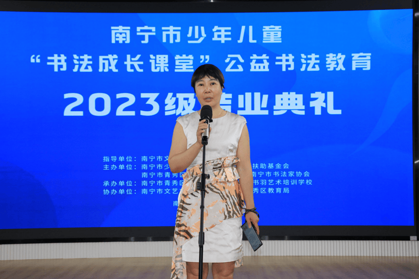 南宁市青秀区联主席唐蓓在致辞中表示: 南宁市少年儿童“书法成长课堂”创办十年,十年如一日,初心不改,成为一个知名品牌,希望同学们努力学习以优异成绩回报社会各界的爱心支持和书法家老师的无私奉献,并希望同学们从这里启航,让书法陪伴你们成长,成为你们终生的兴趣和热爱。