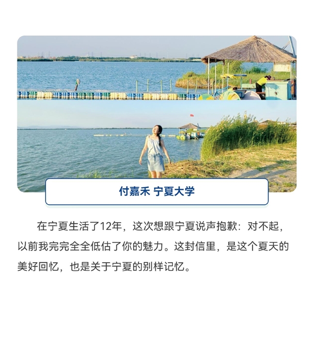 除了记录游玩高光片段,也有同学在作品中对宁夏“深情告白”。攻略达人一等奖获得者付嘉禾,以书信的形式创作的作品表达了对宁夏的热爱。在她的评论区里,宁夏本地年轻人和外地年轻人在评论区热情互动,大家纷纷感慨“好美的小作文、好美的宁夏”“现在就想出发去宁夏”。