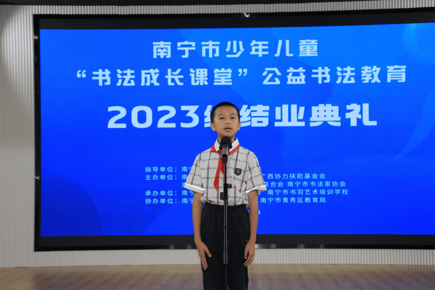 南宁市青秀区联主席唐蓓在致辞中表示: 南宁市少年儿童“书法成长课堂”创办十年,十年如一日,初心不改,成为一个知名品牌,希望同学们努力学习以优异成绩回报社会各界的爱心支持和书法家老师的无私奉献,并希望同学们从这里启航,让书法陪伴你们成长,成为你们终生的兴趣和热爱。