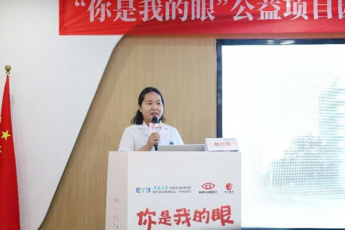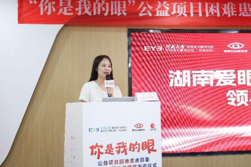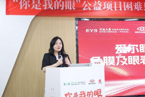 爱尔眼科医院集团事业部总监助理刘语菲致辞 爱尔眼科医院集团事业部总监助理刘语菲女士在致辞中表示:光明对于每个人都是不可或缺的。然而,仍有许多人因各种角膜疾病而导致视力上的损害,希望通过“你是我的眼”公益项目的招募与圆锥角膜公益项目的发布,为那些需要帮助的人点亮希望之光。