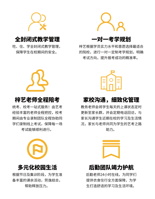 05 特色专精·核心优势 ① 每月组织模拟考试——提前熟知艺考流程,提前适应考场氛围 ② 每日课堂视频记录,课后作业监督——学习过程可视化,课后巩固不松懈 ③ 专业硬,文化强,实力打造双保障 ④ 学籍无忧,创造更多择校机会 ⑤ 艺考状元名师团队授课,教学更精准 通关率更高 ⑥ 一站式服务,考学更无忧(免费提供报考指导、省考带考、校考指导、志愿填报等全流程支持 06 梓艺教育·校园风光 梓艺教育所有校区,均为吃、住、学一体化全封闭式管理模式!毗邻全国各省知名艺术高校,为家长和学生提供更多校区选择,让大家可以足不出省,即可享受北京一线的教学资源和名师指导。