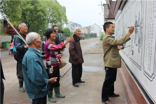 从16岁起,王舍安就开始为生计奔忙。那时候农村照相还不普遍,农忙时他在家务农,农闲时就给村中和附近村庄的太爷、太婆画黑白像。很多时候他也很象样地在各乡镇集市上摆摊,甚至还到过武义县城的戏剧院、百货公司等单位的门口摆画摊,小小年纪的他在俞源村方圆几十里就已有了一定的名声。同时,泥水画技艺也取得了不小的进步。也就在这一年,俞源村的洞主庙外墙上需要画泥水画,村里把这个重担交给了王舍安。王舍安深知机会难得,找来很多画谱进行参照,在墙上画了大量的吉祥图案,30多年过去了,现在这些画像还栩栩如生地展现在洞祖庙的外墙上。洞主庙内原有一幅《八仙图》,因年久已没了图形。1992年,俞源搞民俗文化村开发,洞主庙要在10多平方米的墙上重新画一幅《八仙图》。村里又将这项任务交给王舍安。通过向村里的老人了解原图的人物形象,并加以创造,王舍安重新画了一幅。这幅图中的左上角还比原图多了麻姑和寿星二仙,所以《八仙图》也就成了现在的《仙乐图》,这“二仙”是王舍安加上去的,得到了游客和村民们的认可和赞扬。 王舍安说,以前泥水画基本上都是画在寺庙和祠堂的外墙上,现在古建筑修复工程越来越多,请他去画泥水画的也越来越多,有些仿古建筑的私人住宅、农家乐也开始用泥水画来装饰了。以往泥水画的内容比较单一,以人物走兽、吉祥图案为主。后来,随着眼界的开阔,看到的各种壁画多了,王舍安觉得泥水画的内容应该更丰富一些,于是开始有创新地拓展一些泥水画内容,如将一些山水画、耕读文化、民间传说等融入其中。 三、王舍安的泥塑人生 说到王舍安的泥塑人生还是要回到1992年俞源搞民俗文化村开发时期。当时在洞主庙承担泥塑工作的是一位民间老艺人,王舍安则除了泥水画,还承担一些木匠活。每当休息时,王舍安就站在边上看着老艺人把一团团普通的泥巴捏成一个个神采、姿势不一的塑像。老艺人见王舍安跃跃欲试的样子,就会抽空教他泥塑的技巧。于是王舍安一边做木工活,一边跟着学泥塑,帮着把泥巴“揉熟”、上色等。王舍安手巧灵活一学就会,慢慢地老艺人索性把一些塑像交给了王舍安塑。在那段时间里,王舍安在完成木工活的同时,也学会了泥塑,得到了那位老艺人的真传。其塑起来的塑像与老艺人塑的相差无几,令前来观看的村民赞叹不已。为了更好地掌握泥塑技巧,王舍安经常带些泥巴回家里琢磨,所塑的像越来越神似。