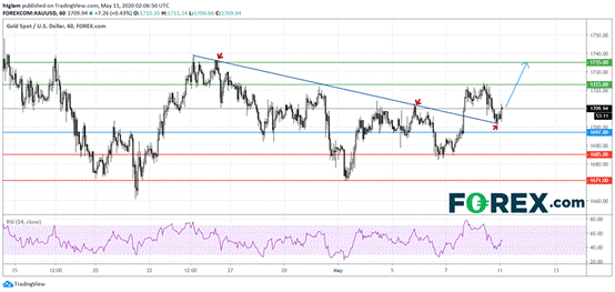 周一(5月11日)亚市盘中,现货黄金继续在1700美元上方窄幅震荡,日内温和乐观的市场情绪令金价涨势受抑。 针对黄金前景表现,forex.com撰文进行简要分析,内容如下: 上周五,4月非农就业岗位锐减2,050万个,失业率飙升至14.7%。 不过,这些数据好于令人沮丧的预期,现货金下跌0.8%,美国三大股指上涨近2.0%。 尽管如此,投资者和政策制定者仍对最糟糕的时刻是否尚未到来持谨慎态度。 在数据出现更持久的改善之前,金价可能会受到高度不确定性和宽松货币政策的支撑。 从技术角度来看,现货金仍处于上涨趋势中,尽管1小时图上显示出温和回撤的势头。 金价在回撤至此前被跌破的看空趋势线后反弹,该趋势线目前转化为支撑。 多头可以将1697美元视为日内短期支撑,之后金价可能会测试阻力位1723美元以及1735美元。 相反,跌破1697美元则暗示,黄金可能会进一步回撤至1685美元。