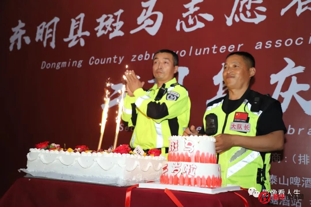 王防震总指挥、王雨增队长共同为 写有“斑马二周岁”的生日蛋糕 点燃生日蜡烛并将其切开 祝愿东明县斑马志愿者协会 不断发展壮大 努力为东明的爱心公益事业做出 新的、更大的贡献