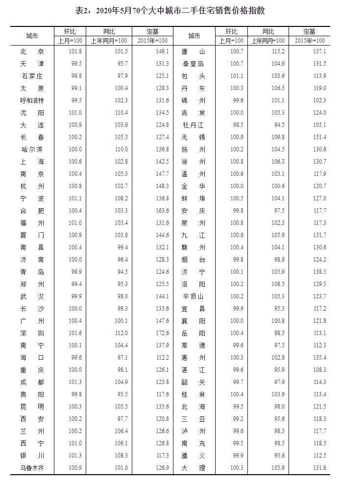 今日,国家统计局发布5月份70个大中城市商品住宅销售价格变动情况统计数据。四大一线城市新房、二手房价格环比均上涨,北京二手房领涨全国。 根据统计局数据显示,在刚过去的5月份,全国70座大中城市中,有57座城市新建商品住宅售价指数环比上涨,环比4月的50城增加了7个城市,一线城市中上海新房价格环比上涨0.8%,深圳、北京、广州分别上涨0.6%、0.5%和0.3%,银川以2.1%的幅度领涨全国;哈尔滨、襄阳环比持平;环比下降城市数量达到11个,三亚以0.4%的幅度领跌。 二手房价格方面,相较于4月26座城市环比下跌的形势,5月二手房价格下跌范围缩小,共有22座城市二手房价环比下降,牡丹江以1.5%的幅度领跌全国;哈尔滨、济南、长沙、重庆、吉林、金华、襄阳等7城二手房价格环比持平;还有41座城市环比上涨,深圳、上海、广州分别上涨1.6%、0.6%和0.4%,北京更是以1.8%的涨幅领涨全国。 此外,70座城市中,共有9座城市新房、二手房环比均下降,其中包括郑州、海口、牡丹江、安庆、湛江、韶关、北海、三亚和遵义;共有39座城市新房、二手房环比均上涨,分别是北京、沈阳、大连、长春、上海、南京、杭州、宁波、福州、厦门、南昌、广州、深圳、南宁、成都、昆明、西安、兰州、西宁、银川、乌鲁木齐、唐山、秦皇岛、包头、丹东、无锡、扬州、徐州、温州、蚌埠、泉州、九江、赣州、济宁、洛阳、平顶山、岳阳、惠州和桂林。 四个一线城市新房二手房价格环比均上涨,上海、深圳、北京、广州新房价格环比分别上涨0.8%、0.6%、0.5%和0.3%,北京、深圳、上海、广州二手房价格环比分别上涨1.8%、1.6%、0.6%和0.4%。