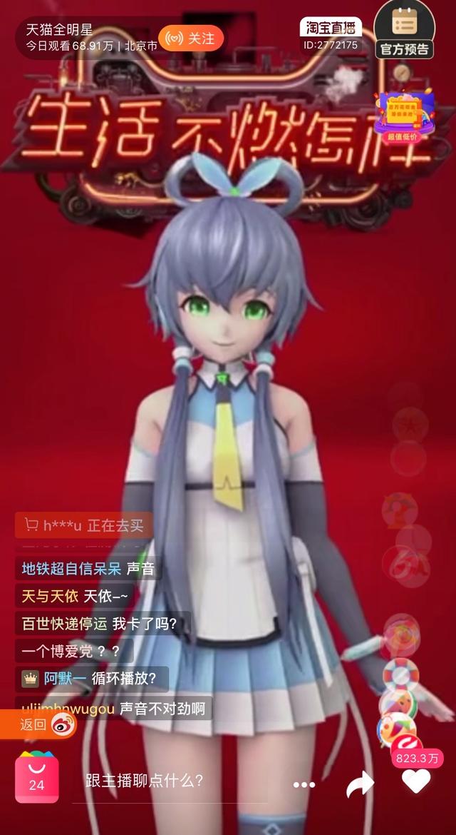 电商平台、MCN押注,虚拟主播能杀出下一个薇娅、李佳琦吗? 文 | 周逸斐 编辑 | 张宇婷 6月3日晚,天猫全明星直播间,当时针刚指向数字“9”,一改前半场母婴专场的冷清氛围,直播间突然变得异常热闹起来。 屏幕左下角疯狂滚动“洛天依”等字眼的留言,淘宝直播间的观看量约以万/秒的单位暴涨。 和以往装扮相同,灰发、绿瞳的“少女”洛天依,终于在“万众瞩目”中闪亮出场。 “大家好,我是洛天依,作为天猫618助燃大使......”然而,开口第一句,万众期待的国民级虚拟歌姬洛天依在热场视频中,却发出了异于以往的声音,沙哑而刺耳,并且循环往复同一台词。 “洛天依声音不对劲,是我卡了吗?”、“崽崽怎么一直循环出现?”、“平台又出问题了?”,评论区瞬间炸开了锅。 6月3日晚9点的天猫全明星直播间