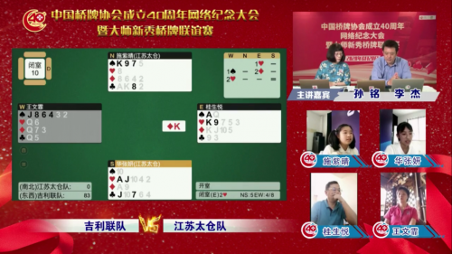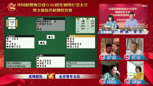中国桥牌协会协会成立40周年主题口号 中国桥牌协会主席刘晓江以视频形式致辞。他在致辞中说到,40年来,中国桥牌协会加强自身建设,始终以人为本,与各级桥牌组织携手为桥牌运动的发展构建日益健全的保障体系;中国桥牌界始终牢记初心,坚持为社会主义精神文明建设服务;中国桥牌界始终使命在肩,坚持改革创新,为建设体育强国和健康中国贡献力量;中国桥牌界以为国争光为己任,以牌为桥,向世界展示中华风采。未来中国桥牌协会将走解放思想的创新之路、面向市场的产业之路、连通世界的开放之路,引领中国桥牌紧跟时代步伐,脚踏奋进之路,书写新的辉煌。 除中国桥牌协会位于北京的主会场外,全国还设有9个分会场,既有浙江、宁波、太仓等省市桥协,也有北京海淀区桥牌协会这样的基层组织,还有锦烁、普得A类俱乐部以及天津师范大学、深圳职业技术学院等高校,上海圣醒桥牌俱乐部作为培训机构代表也设立了分会场。在现场连线中,各分会场为中国桥牌协会成立40周年送来祝福,并介绍了所在地区、单位的桥牌发展情况及取得成绩,大家纷纷表示未来还将一如既往支持中国桥牌运动,为提高中国桥牌竞技水平,推动中国桥牌更好发展贡献力量。