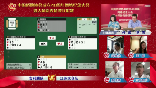 6月20日上午,中国桥牌协会举办了成立40周年网络纪念大会暨大师新秀桥牌联谊赛。活动通过网络平台全程直播,有超过百万人次观看。 活动分为纪念仪式和联谊赛两部分。首先以宣传片形式,从规则契约、智慧博弈、协作发展、全民共享、改革展望等五个篇章回顾总结了中国桥牌40年发展成绩,提出了“面向新世界,我来做庄家”的主题口号。