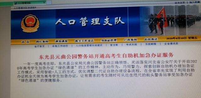 一年一度高考在即,东光县公安局元曲公园警务站正确领悟、灵活落实河北省公安厅关于开启2020年高考学生加急办证“绿色通道”的工作精神,主动作为、巧用警力,探索创新自助机办理加急证工作模式,采用智能+人工的方式,优化调整二代证自助办理设备流程,在全省率先实现了利用自助办证机全天候为高考学生加急办证,让有需求的考生随时可从近在咫尺的街头警务站享受加急办证“绿色通道”的便捷服务。