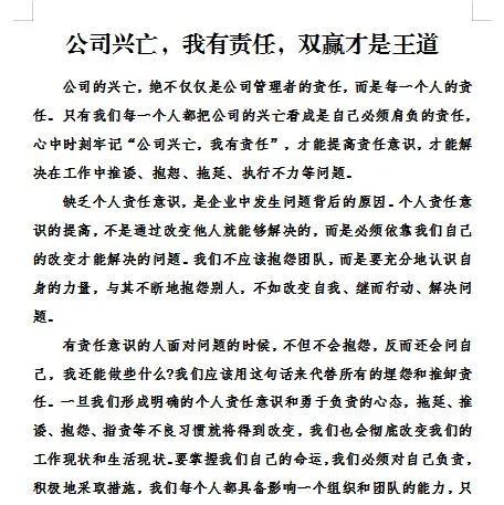 会议在《众人划桨开大船》激昂的旋律中拉开帷幕。全体人员奏唱歌曲,感受团队力量的强大。随后综合管理部副部长杨磊分享《公司兴亡,我有责任,双赢才是王道》一文,全体人员分享学习心得。参会人员在分享交流中加深了对团队和个人关系紧密相连的理解,明确认识到提高责任意识的重要性。 文章分享