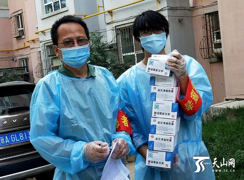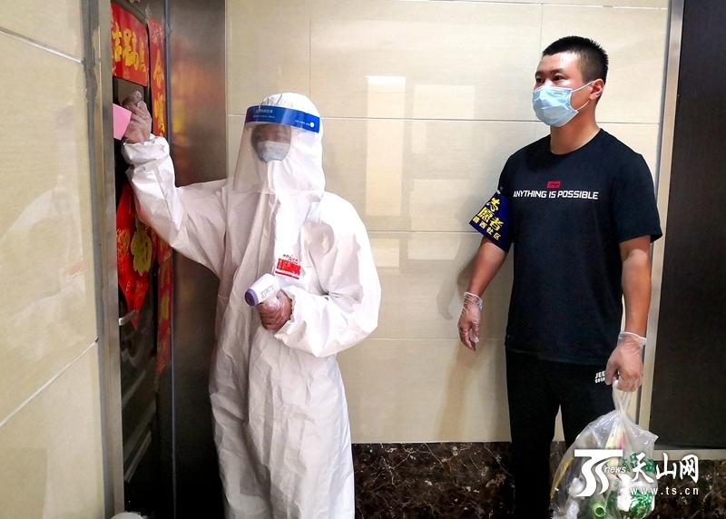 陈运良(左)和侄子张宇佳 “我家”中的大学生搭档 乌鲁木齐市黄河路自治区监狱管理局家属院里,住着300多户居民,35位居民组成了“我家”志愿者服务队,他们中有共产党员、医生、公务员、新闻工作者、退伍军人、大学生等。 大学生志愿者孙瑞和王新旭,积极参与到这项特别的志愿服务中,他们两人搭档每天负责为住户测体温、送菜、送药、楼道消杀、垃圾清理等工作。