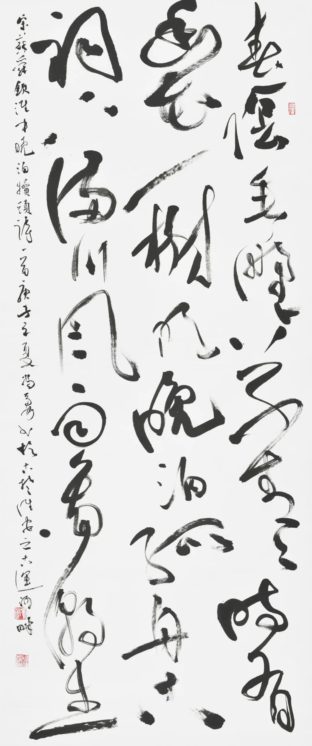 释文: 苏舜钦诗《淮中晚泊犊头》 春阴垂野草青青,时有幽花一树明。 晚泊孤舟古祠下,满川风雨看潮生。 尺寸:60cmx180cm
