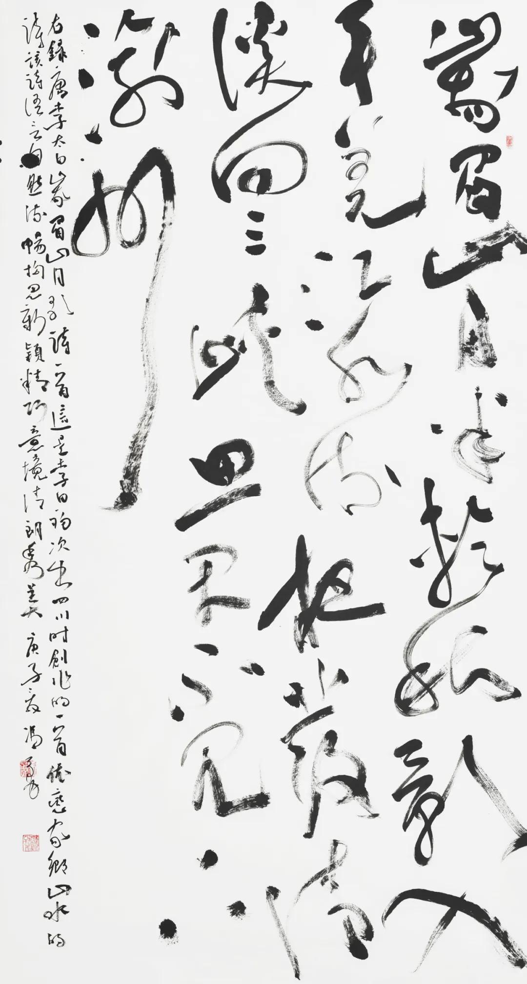 释文: 张旭诗《山中留客》 山光物态弄春晖,莫为轻阴便拟归。 纵使晴明无雨色,入云深处亦沾衣。 尺寸:90cmx180cm