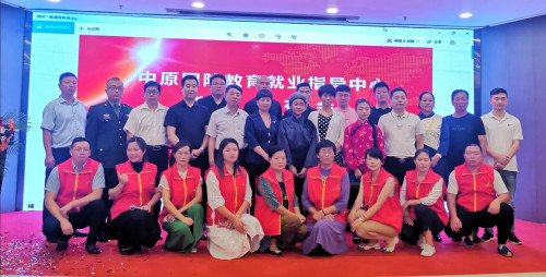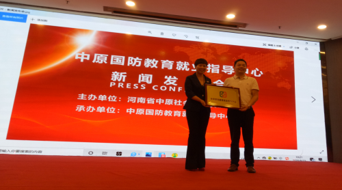 图:河南省中原社会工作发展基金会理事长袁峰与中原国防教育就业指导中心负责人李万霞董事长共同在指导中心揭牌