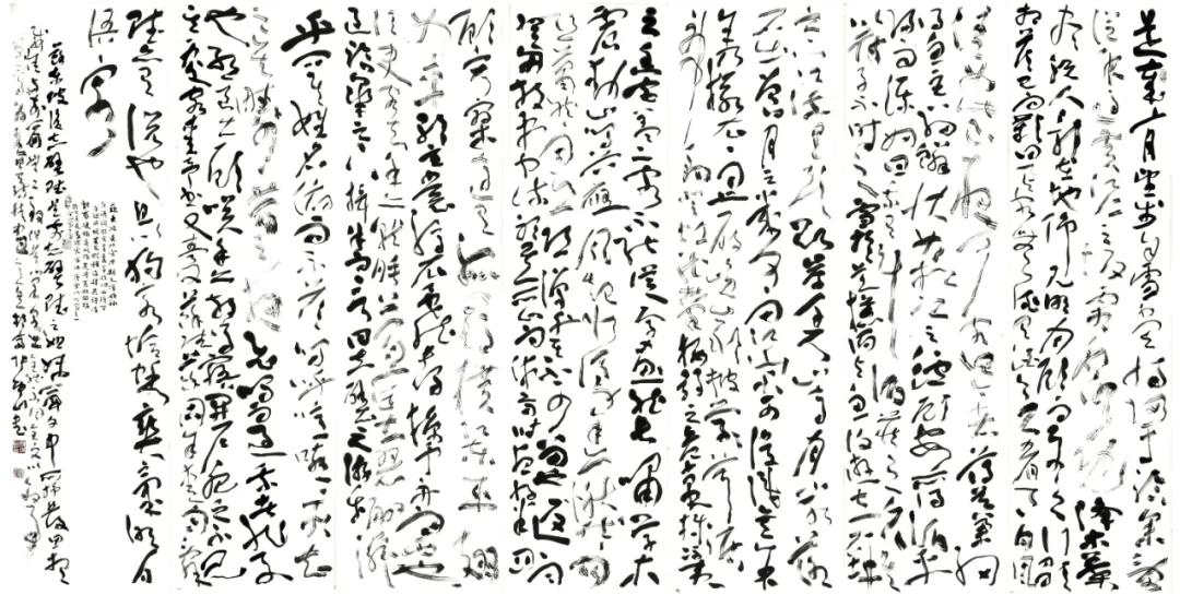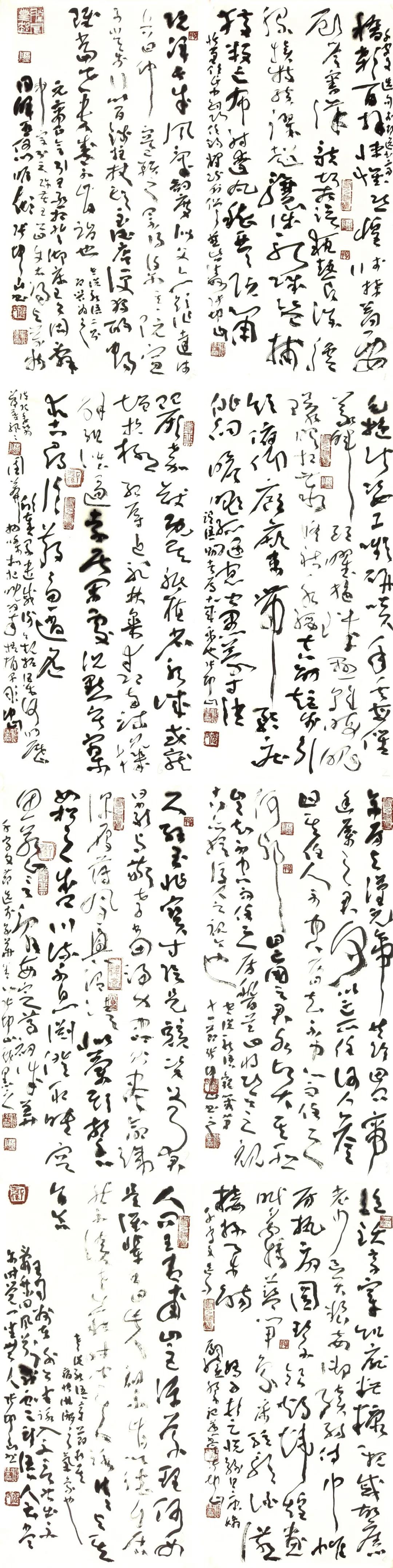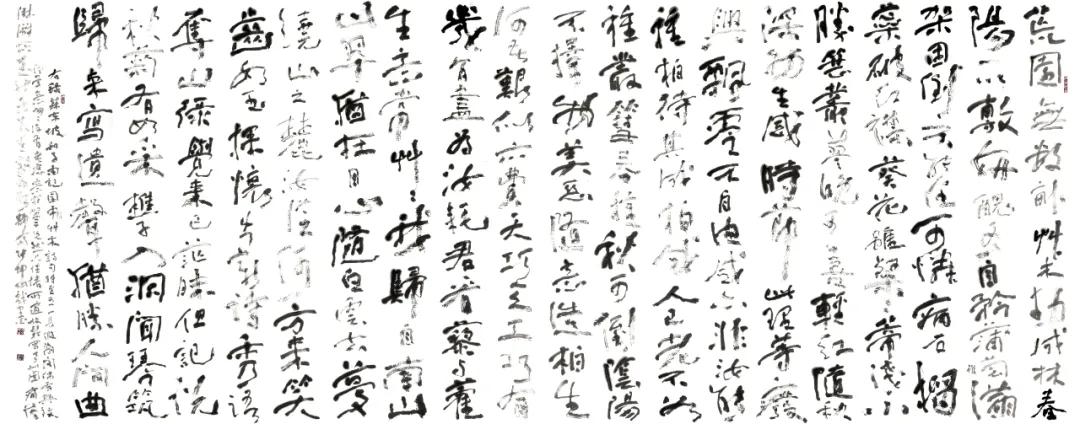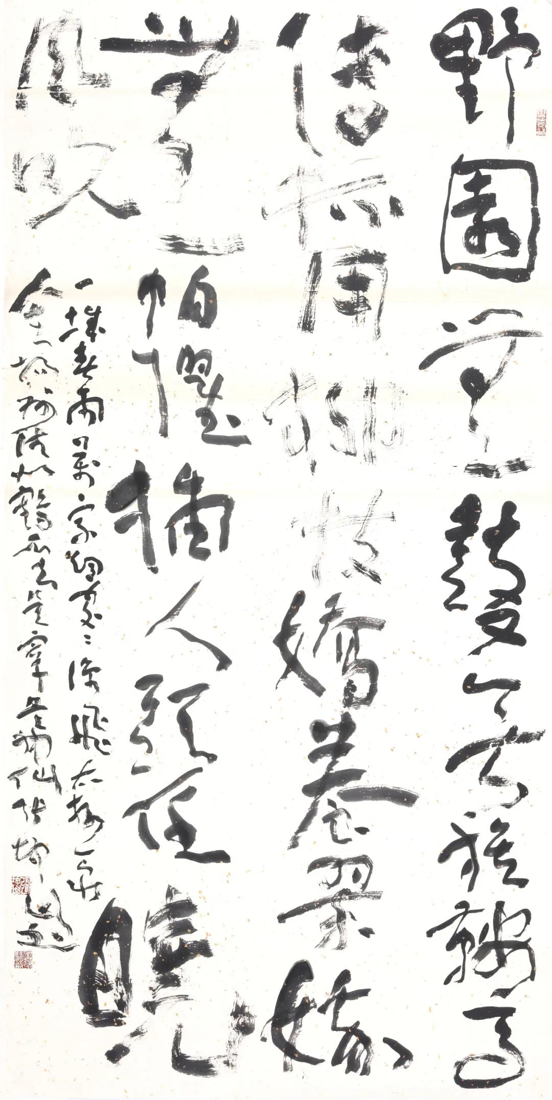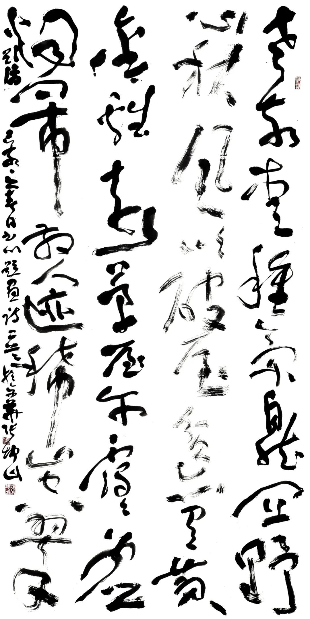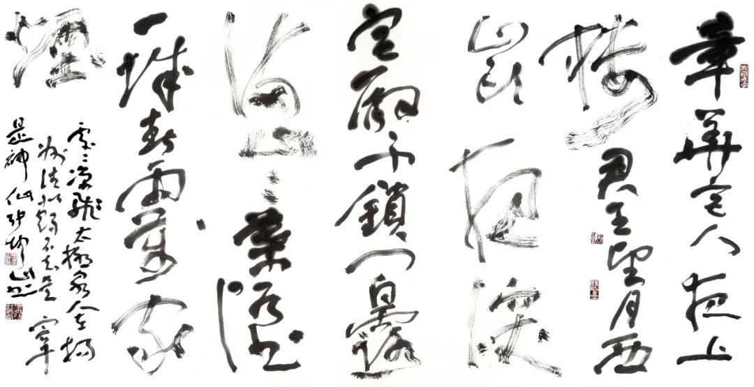张坤山作品 张坤山先生展出的百余幅精品力作,既有鸿篇巨制,也有尺幅小品,书体兼顾,重点突出,比较全面完整地展示了他的创作高度和创作走向。尤其是他的大草书风高古奇崛,纵横畅达,充分表达着一种古典而新颖、博大而深邃的艺术情怀,在当代书坛独标气格。