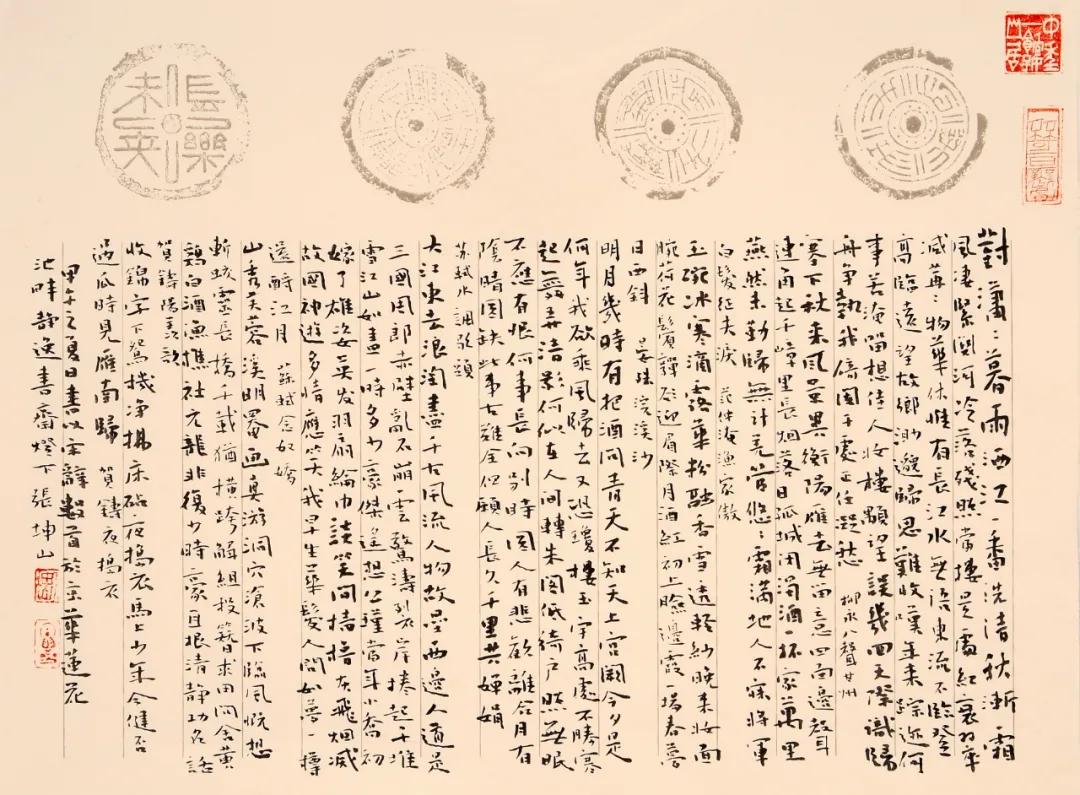 张坤山作品 数十年的翰墨因缘,张坤山始终铭记齐鲁大地对他的养育,他深深地感恩山东这个享有几千年传统文化盛誉的文化圣地,赋予了他热爱书法的初心和文化的濡养,还有坚定的意志和锲而不舍的进取精神。 从展览构思、创作调整到今天展出,作者与我们共同经历了非凡岁月。今天,我们真诚期待“承古书怀”能为大家带来沉雄博大的文化自信与审美体验。