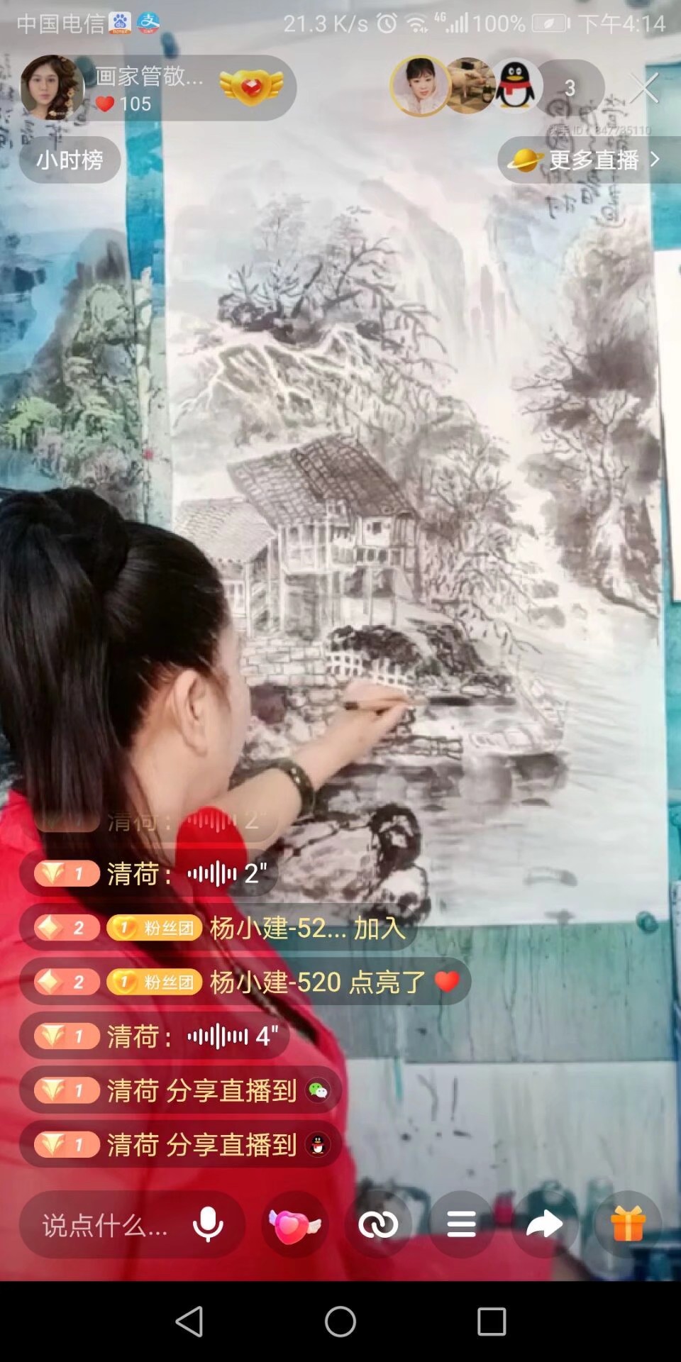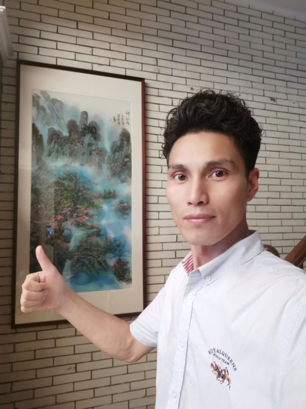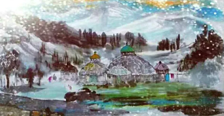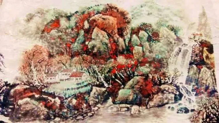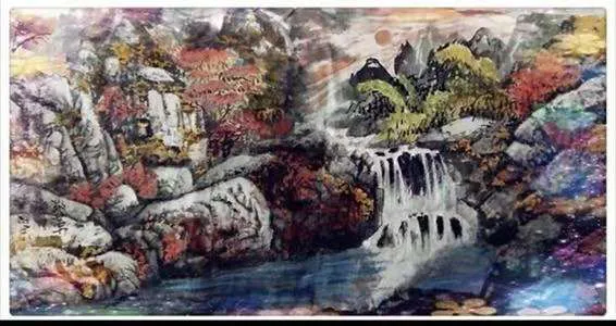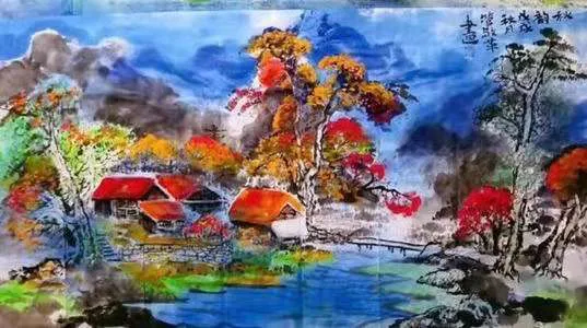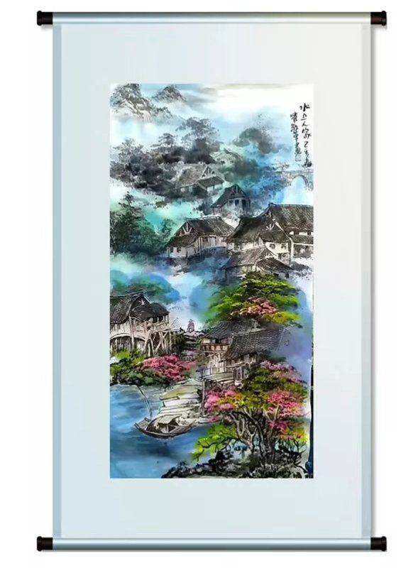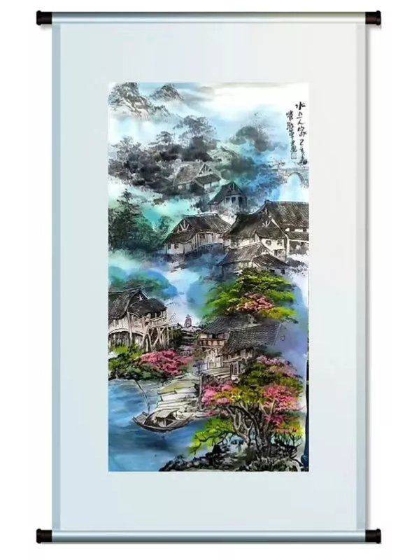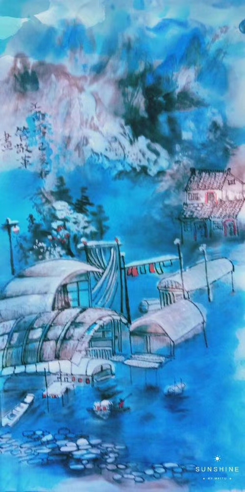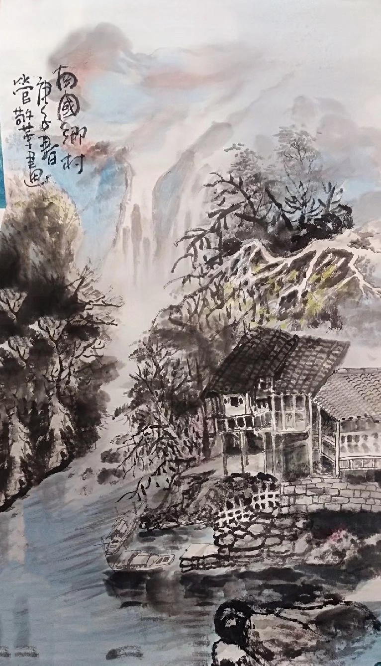 国礼画家管敬革水上人家画 ——扬州黄资源点评 2020.07.14 翠滴朦胧处, 水上人家住, 近水远山景, 蓑笠渔翁主。 小船依岸旁, 色彩绚多样, 小桥流水绿, 疑似天宫降。