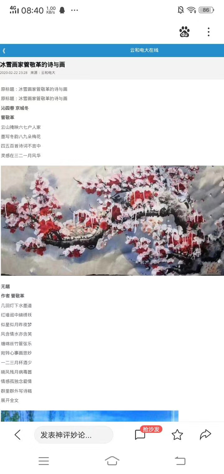 00:10 雪梅香如故 作者 管敬革 我欲寻梅探幽处 可怜前方已无路 但见银海仙无限 粲粲琼白美人故 梅索笑声竹含贞 酒醉频频留恋户 矜香斗色几十千 寒林水墨瑶台树 奇妙歌声孰能名 起舞翩翩白雪妒 聊聊卿卿叹我情 谁家颦蹙悄然住