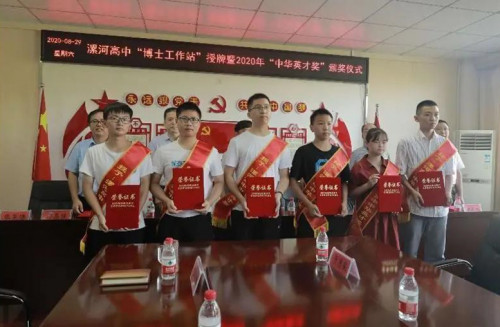 仪式上,中国教育科学研究院党委委员、教育法治与标准研究所所长杨润勇博士授予漯河高中“中国教育科学研究院杨润勇博士工作站”牌匾。漯河高中党委委员、副校长郭全昌宣读《漯河高中关于2020年高考“中华英才奖”的表彰决定》,获奖的18名学生中,有6名学生被清华大学录取,5名学生被北京大学录取,1名学生被海军航空大学录取,6名学生被香港理工大学等名校录取。与会领导为18名获奖学生颁发荣誉证书,名师领航工程教育发展基金赵晓红女士为获奖学生颁发奖励基金和奖杯。