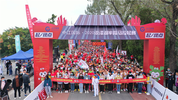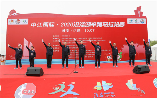 一个赛事品牌,一个城市节日。秋日的洪泽湖大堤色彩斑斓,天空湛蓝澄净,红绿相间的彩色赛道上人潮涌动……10月7日8时30分,中江国际·2020洪泽湖半程马拉松赛鸣枪开赛,5000余名跑友齐聚洪泽湖畔,沿着世界文化遗产、“国家4A级景区”、江苏省“最美跑步线路”、有着1800余年历史的洪泽湖古堰尽情挥洒激情。洪泽区委书记张冲林,江苏省体育局竞赛管理中心副主任胡卫权,洪泽区人大常委会主任杨步新,洪泽区政协主席陈继信,淮安市体育局副局长祁德霞,洪泽区委常委、宣传部部长花群,洪泽区人民政府副区长徐琳,洪泽区人民政府副区长、公安分局局长费凌云,冠名单位中江国际代表翟久鹏共同为赛事鸣枪发令。
