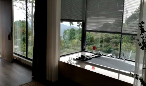图片:躺在玻璃窗下的浴缸里观景别有风趣 翻动起层层浪花,设计者没有将浴盆关进浴室间,而是安放在临窗的台面之中,这一大胆的改变把自然人完全送入自然的怀抱,客人在温水的拍打和按摩下,同时接受阳光沐浴,尽享满眼的碧绿和扑鼻的芬芳;民宿餐厅的素食材基本依靠就地取材,大多为天然野生,像漫坡、满地的扁担根(鱼腥草)、番薯藤、南瓜叶、萝卜缨、马兰草、野芹菜、节笋、瞢菜等野菜,随取随用,我记得童年时代野菜多是拿来喂猪的,如今都端上餐桌,城里人稀罕的大筷朵颐,嘴里念叨着营养价值高,真是土特产胜过了美味珍馐……林林总总,现代的民宿设施与农村的文化元素恰如其分的结合,我看出小风超前思考和做事智慧。