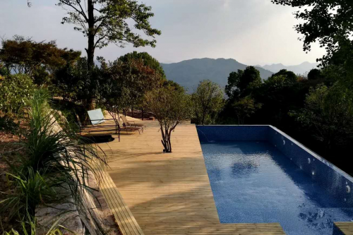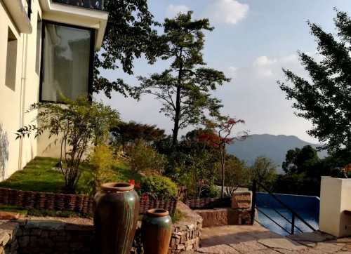 图片:秀色庭院里的文化 的镶嵌于古老山村的新型业态。这个民宿没有摒弃古陈、田园的元素,而是巧妙的与现代功能、设施融合。庭院中湛蓝水面的露天泳池有现代的洁水、换水功能,池水的深浅符合不同群体的要求。泳池与海滩浴场、室内泳池以及传统的露天泳池有天然的区别,它与精耕细作的菜园为邻,参天的香樟、红枫、柿子树的冠能遮风挡雨,遮阳避日,是天然的大伞;散漫任性的山溪由上而下,依山势呼啸着狂奔,如脱缰的野马,然流入庭院后须臾变得淑女起来,她依循屋主人设定的路线,缓步迂回在房前屋后,院落之中,她长长的“裙摆”下,一群锦鲤簇拥着尾随、追逐;曲径通幽的小路由古朴的青石板和陈旧瓦砾铺出,低矮的围墙也多是民国时代的旧料砌筑,漫步其中,脑海里不免出现尘封的文字,不由自己地会想起久远的故事;中秋圆月高挂,庭院里的灯光闪烁起来,从灯笼式的玻璃灯罩中透出的光线柔和而温暖,有如烛光仰起了小脑袋,与向下俯视的月光窃窃私语;大浴盆中的水
