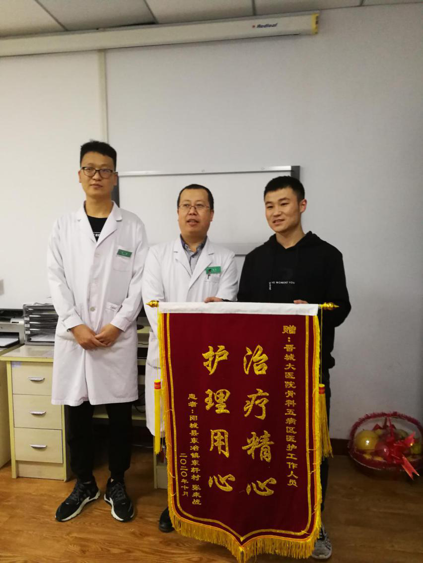 近日,为感谢山西省晋城大医院骨科五病区医护工作人员对亲人张来战的治疗和护理,阳城县东冶镇东轩村村民张来战的大儿子张志敏手捧锦旗,代表全家将一面“精心治疗,用心护理”的锦旗送到了医护人员手中,以表达诚挚的感激之情和他们一家对晋城大医院医务人员热情服务、精心治疗的高度赞扬和肯定。 张志敏介绍,父亲张来战是在一起交通事故中受的伤,当时伤情很重,在晋城大医院重症监护室足足治疗了8天,仅骨折处多达10余处。是晋城大医院骨科五病区的医护工作人员为父亲做了3处、5次手术,实施了78天的精心治疗才得以康复出院的。是医护工作人员认真负责、亲切体贴,高尚的医德医风抚慰了因事故造成的心灵伤痛。 患者把对医生最诚挚谢意凝结成一面光辉的锦旗。这面小小的锦旗,送去了患者和家属对医务人员所付出辛勤劳动和医疗技术的最高肯定。晋城大医院骨科五病区对患者全心全意的努力和付出,正在无形中默默书写着新时代和谐的医患关系。 (牛志军 郭学良) |