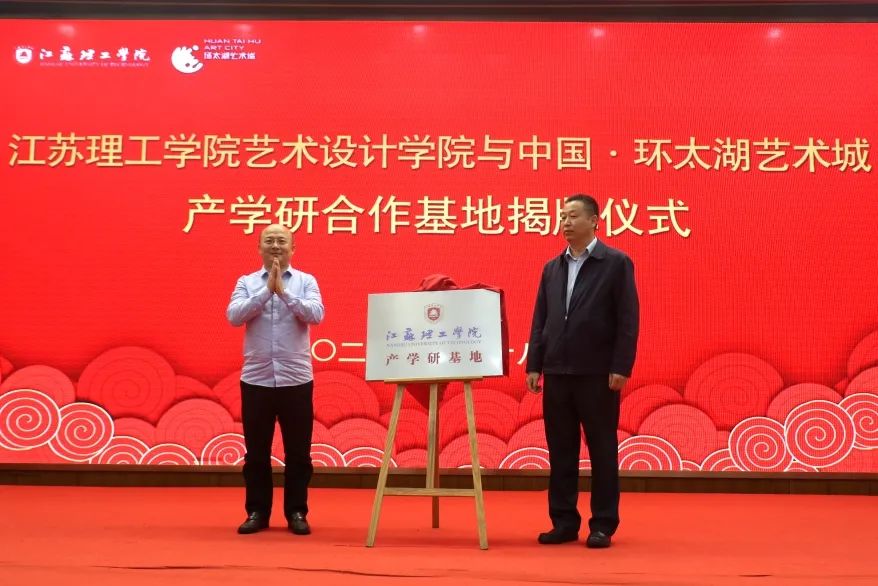 ↑江苏理工学院艺术设计学院党委书记钱云福先生与江苏环太湖文化艺术城集团有限公司董事长钱臣先生为实习基地、产学研合作基地揭牌仪式